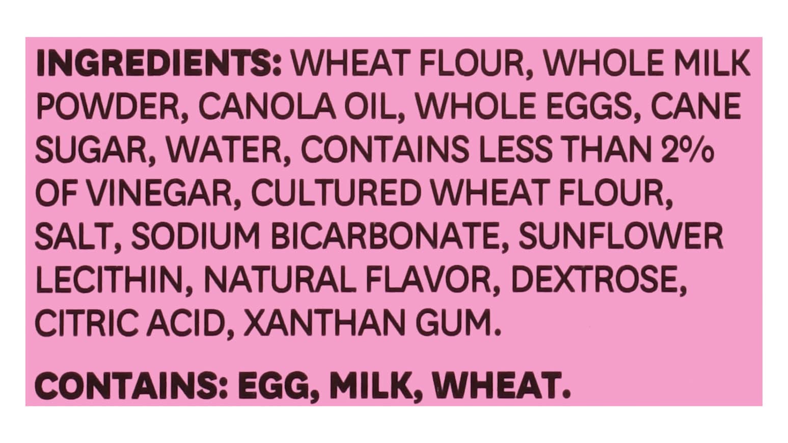 Ingredients: Wheat Flour, Whole Milk Powder, Canola Oil, Whole Eggs, Cane Sugar, Water, Contains Less than 2% of Vinegar, Cultured Wheat Flour, Salt, Sodium Bicarbonate, Sunflower Lecithin, Natural Flavor, Dextrose, Citric Acid, Xanthan Gum Contains: Eggs, Milk, Wheat