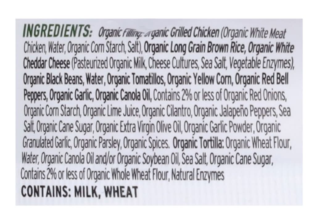 Ingredients: Organic Filling: Organic Grilled Chicken (Organic White Meat Chicken, Water, Organic Corn Starch, Salt), Organic Long Grain Brown Rice, Organic White Cheddar Cheese (Pasteurized Organic Milk, Cheese Cultures, Sea Salt, Vegetable Enzymes), Organic Black Beans, Water, Organic Tomatillos, Organic Yellow Corn, Organic Red Bell Peppers, Organic Garlic, Organic Canola Oil, Contains 2% or Less of Organic Red Onions, Organic Corn Starch, Organic Lime Juice, Organic Cilantro, Organic Jalapeno Peppers, Sea Salt, Organic Cane Sugar, Organic Extra Virgin Olive Oil, Organic Garlic Powder, Organic Granulated Garlic, Organic Parsley, Organic Spices. Organic Tortilla: Organic Wheat Flour, Water, Organic Canola Oil and/or Organic Soybean Oil, Sea Salt, Organic Cane Sugar, Contains 2% or Less of Organic Whole Wheat Flour, Natural Enzymes Contains: Corn, Milk, Wheat, Soybeans