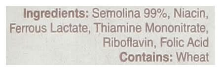 Ingredients: Semolina 99%, Niacin, Ferrous Lactate, Thiamine Mononitrate, Riboflavin, Folic Acid Contains: Wheat