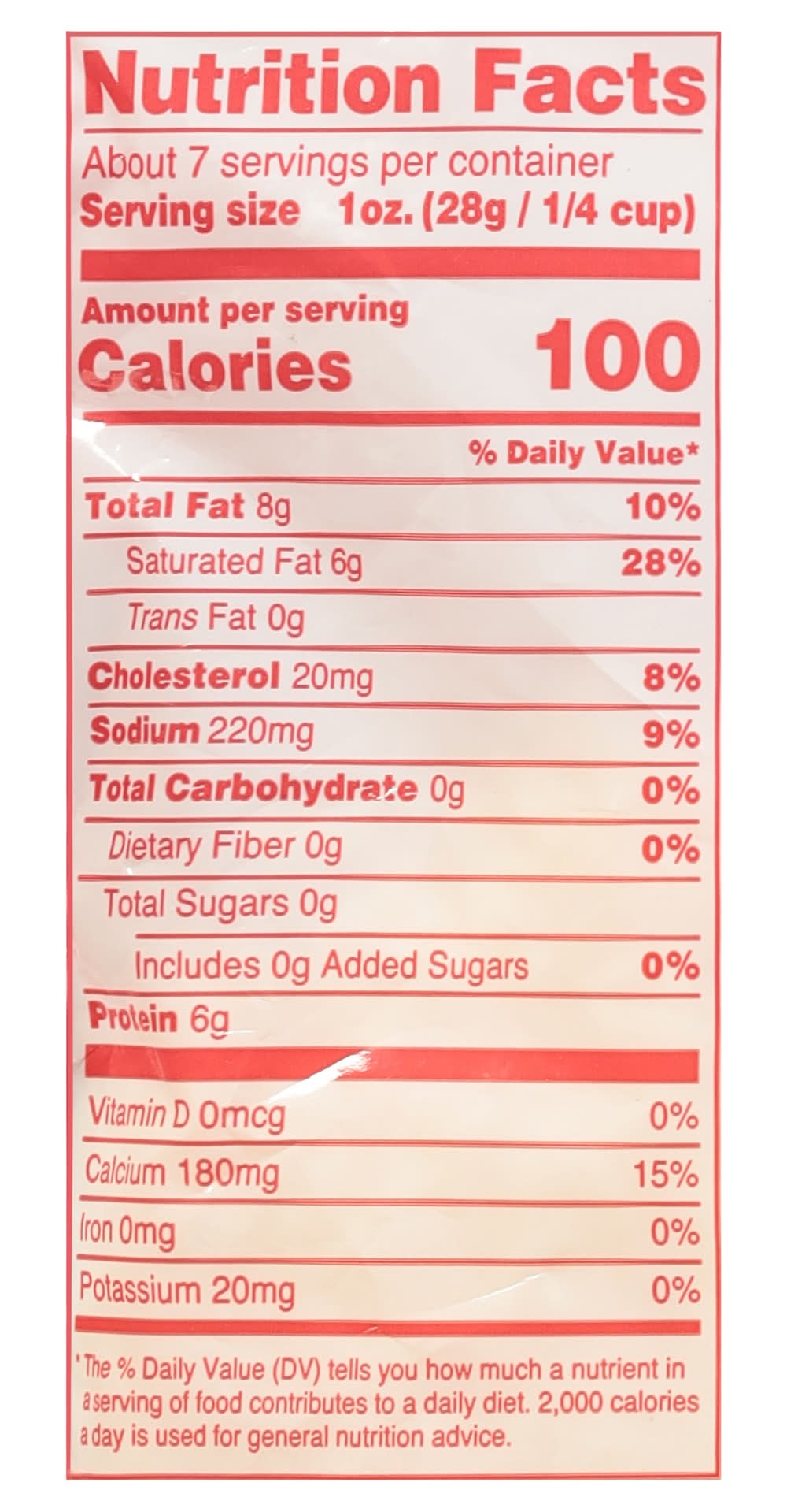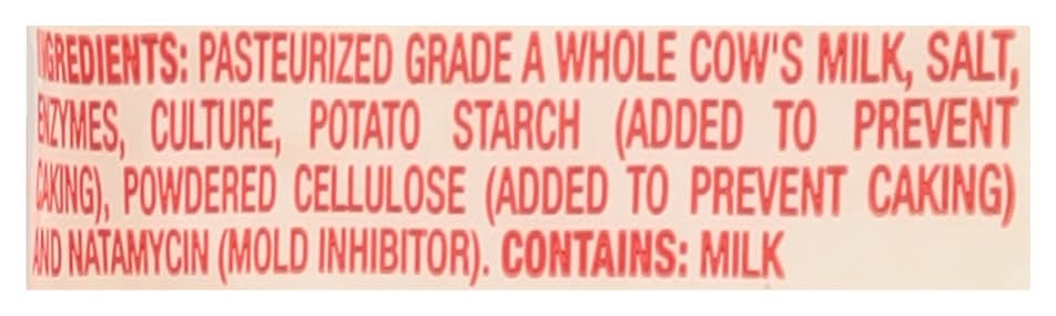 Ingredients: Pasteurized Grade A Whole Cow's Milk, Salt, Enzymes, Culture, Potato Starch (Added to Prevent Caking), Powdered Cellulose (Added to Prevent Caking) and Natamycin (Mold Inhibitor) Contains: Milk