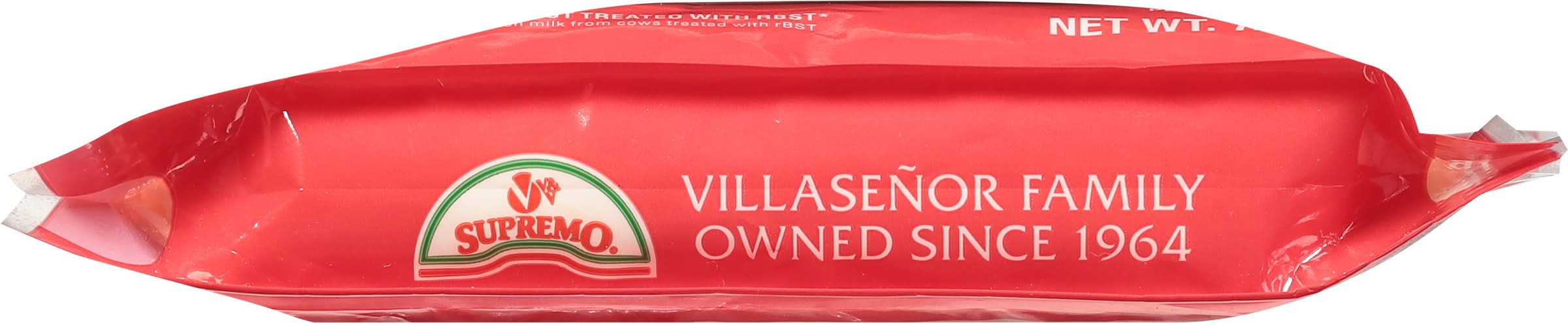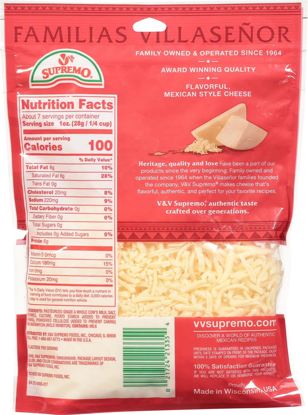 Mexican style quesadilla cheese for melting. Approx. 1 3/4 cups. 0 g lactose per serving. World championship cheese contest. Established 1957. Master Cheesemaker Wisconsin. Villasenor family owned since 1964. Natural cheese. Family owned & operated since 1964. Award winning quality. Flavorful, Mexican style cheese. Heritage, quality and love have been a part of our products since the very beginning. Family owned and operated since 1964 when the villaseñor families founded the company, v&v supremo makes cheese that's flavorful, authentic, and perfect for your favorite recipes. V&V Supremo, authentic taste crafted over generations. Cheese made with milk from cows not treated with RBST (No rbST hormone. Made with milk from cows raised without added rbST hormone (No significant difference has been shown between milk derived from rbST-treated and non rbST-treated cows). Discover a world of authentic Mexican recipes. 100% satisfaction guaranteed. Number of servings: 7