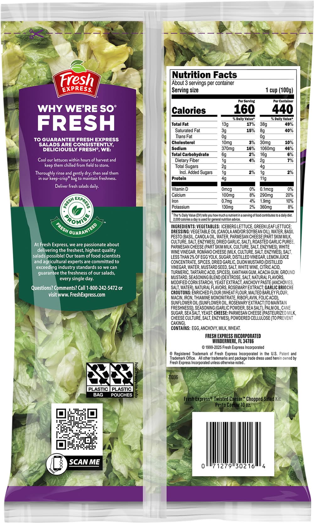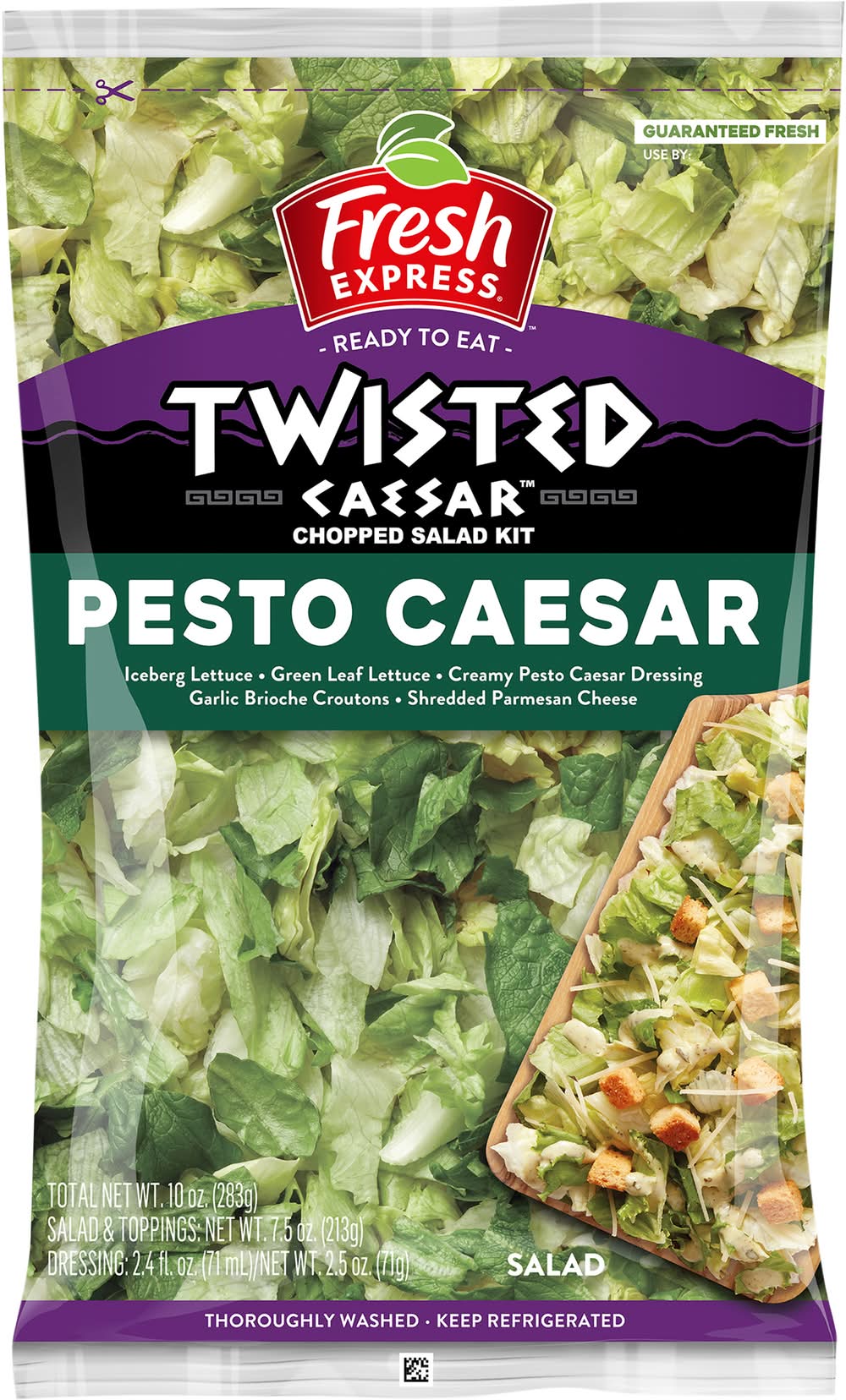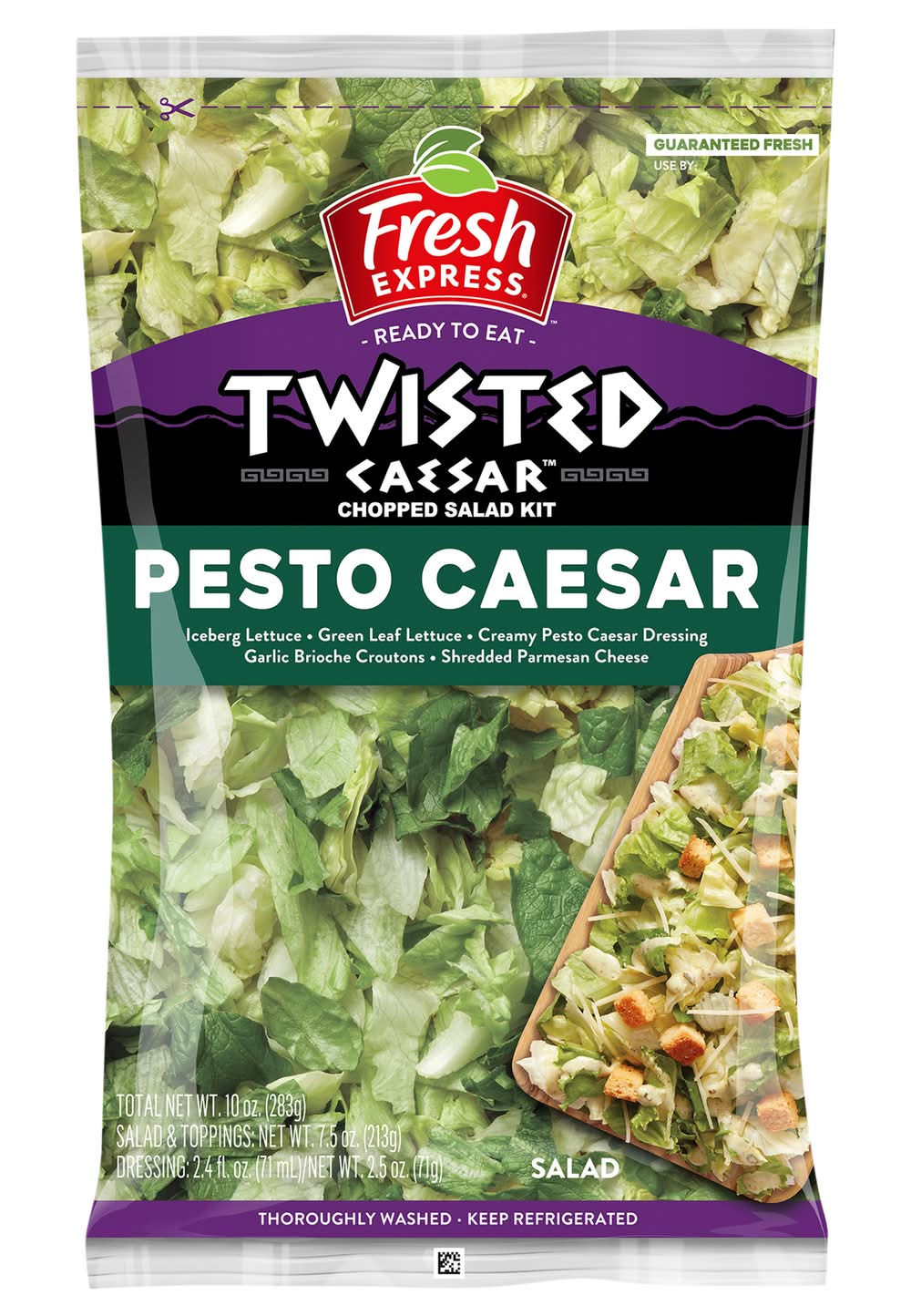 Iceberg lettuce, green leaf lettuce. Creamy pesto caesar dressing. Garlic brioche croutons. Shredded parmesan cheese. New! Why we're so fresh: To guarantee fresh express salad kits are consistently, deliciously fresh, we: Cool our lettuces within hours of harvest and keep them chilled from field to store. Thoroughly rinse and gently dry; then seal them in our keep-crisp bag to maintain freshness. Deliver fresh salad kits daily. Thoroughly washed. Ready to eat. Fresh Express promise. Fresh guaranteed! At fresh express, we are passionate about delivering the freshest, highest quality salads possible! Our team of food scientist and agricultural experts are committed to exceeding industry standards so we can guarantee the freshness of our salads, every single day.