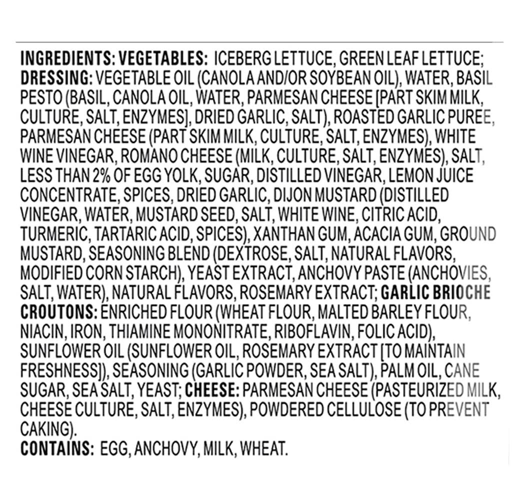 Ingredients: Vegetables: Iceberg Lettuce, Green Leaf Lettuce; Dressing: Vegetable Oil (Canola and/or Soybean Oil), Water, Basil Pesto (Basil, Canola Oil, Water, Parmesan Cheese [Part Skim Milk, Culture, Salt, Enzymes], Dried Garlic, Salt), Roasted Garlic Puree, Parmesan Cheese (Part Skim Milk, Culture, Salt, Enzymes), White Wine Vinegar, Romano Cheese (Milk, Culture, Salt, Enzymes), Salt, Less than 2% of Egg Yolk, Sugar, Distilled Vinegar, Lemon Juice Concentrate, Spices, Dried Garlic, Dijon Mustard (Distilled Vinegar, Water, Mustard Seed, Salt, White Wine, Citric Acid, Turmeric, Tartaric Acid, Spices), Xanthan Gum, Acacia Gum, Ground Mustard, Seasoning Blend (Dextrose, Salt, Natural Flavors, Modified Corn Starch), Yeast Extract, Anchovy Paste (Anchovies, Salt, Water), Natural Flavors, Rosemary Extract; Garlic Brioche Croutons: Enriched Flour (Wheat Flour, Malted Barley Flour, Niacin, Iron, Thiamine Mononitrate, Riboflavin, Folic Acid), Sunflower Oil (Sunflower Oil, Rosemary Extract [to Maintain Freshness]), Seasoning (Garlic Powder, Sea Salt), Palm Oil, Cane Sugar, Sea Salt, Yeast; Cheese: Parmesan Cheese (Pasteurized Milk, Cheese Culture, Salt, Enzymes), Powdered Cellulose (to Prevent Caking) Contains: Eggs, Fish, Anchovy, Milk, Wheat, Barley, Mustard, Soybeans