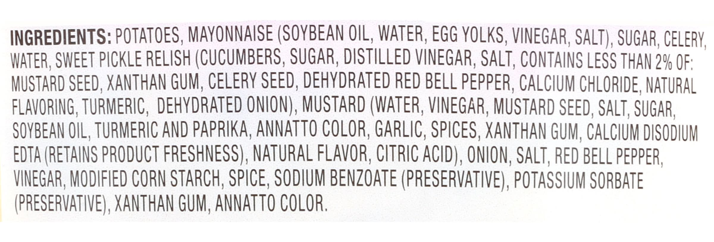 Ingredients: Potatoes, Mayonnaise (Soybean Oil, Water, Egg Yolks, Vinegar, Salt), Sugar, Celery, Water Sweet Pickle Relish (Cucumbers, Sugar, Distilled Vinegar, Salt, Contains Less than 2% of: Mustard Seed, Xanthan Gum Celery Seed, Dehydrated Red Bell Pepper, Calcium Chloride, Natural Flavoring, Turmeric, Dehydrated Onion) Mustard (Water, Vinegar, Mustard Seed, Salt, Sugar, Soybean Oil, Turmeric and Paprika, Annatto Color, Garlic, Spices Xanthan Gum, Calcium Disodium EDTA (Retains Product Freshness) Natural Flavor, Citric Acid), Onion, Salt, Red Bell Pepper, Vinegar, Modified Corn Starch, Spice, Sodium Benzoate (Preservative), Potassium Sorbate (Preservative), Xanthan Gum, Annatto Color Contains: Eggs, Soybeans