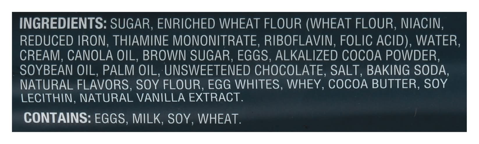 Ingredients: Sugar, Enriched Wheat Flour (Wheat Flour, Niacin, Reduced Iron, Thiamine Mononitrate, Riboflavin, Folic Acid), Water, Cream, Canola Oil, Brown Sugar, Eggs, Alkalized Cocoa Powder, Soybean Oil, Palm Oil, Unsweetened Chocolate, Salt, Baking Soda, Natural Flavors, Soy Flour, Egg Whites, Whey, Cocoa Butter, Soy Lecithin, Natural Vanilla Extract Contains: Wheat, Eggs, Soybeans, Milk