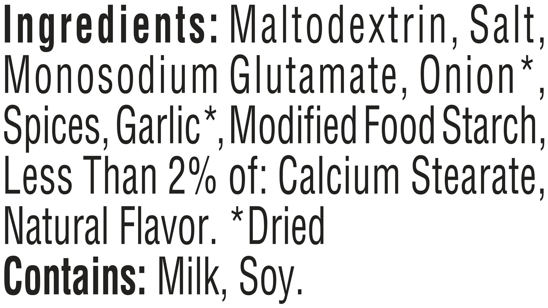 Ingredients: Maltodextrin, Salt, Monosodium Glutamate, Onion (1), Spices, Garlic (1), Modified Food Starch, Less Than 2% of: Calcium Stearate, Natural Flavor. (1) Dried. Contains: Milk, Soy. Contains: Milk, Soybeans