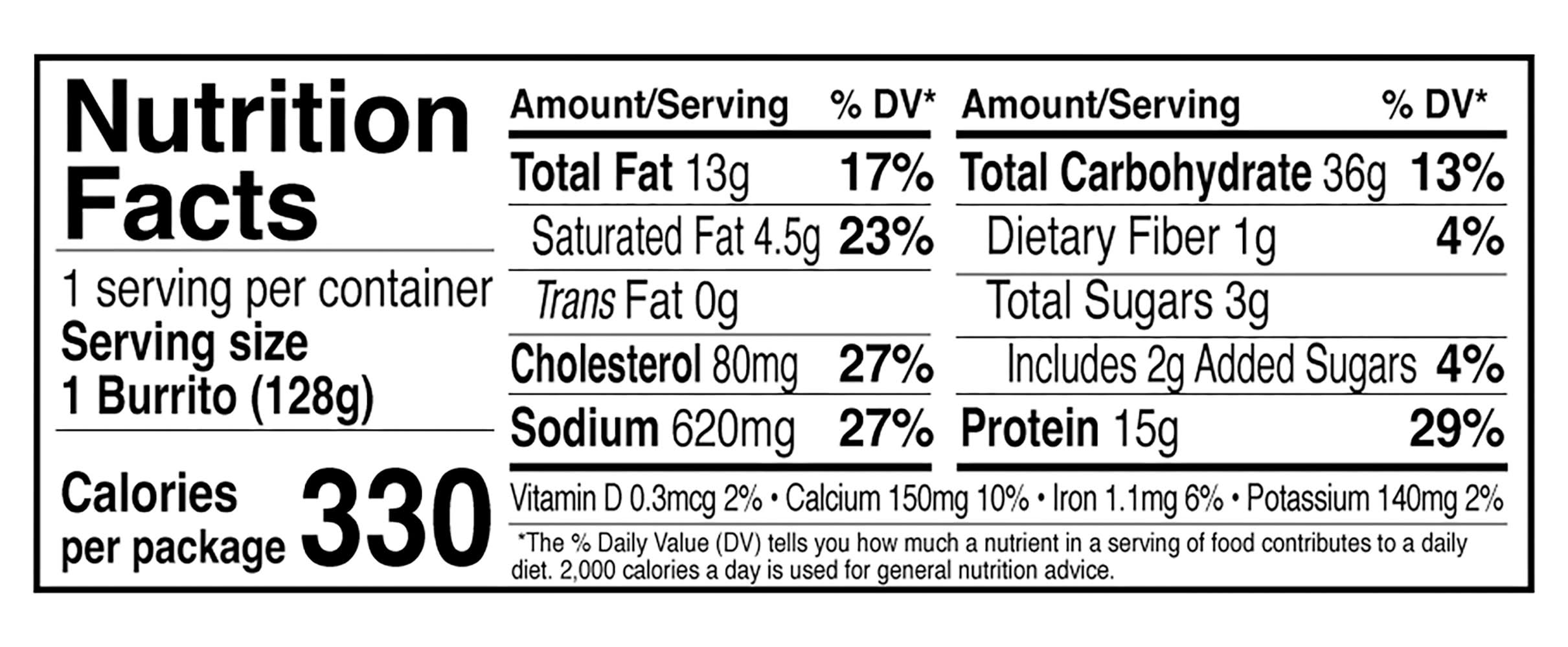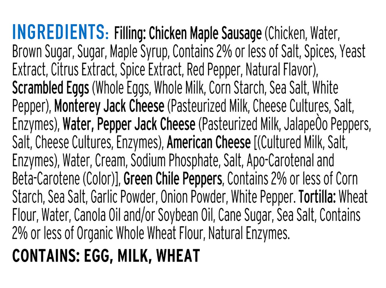 Ingredients: Filling: Chicken Maple Sausage (Chicken, Water, Brown Sugar, Sugar, Maple Syrup, Contains 2% or Less of Salt, Spices, Yeast Extract, Citrus Extract, Spice Extract, Red Pepper, Natural Flavor), Scrambled Eggs (Whole Eggs, Whole Milk, Corn Starch, Sea Salt, White Pepper), Monterey Jack Cheese (Pasteurized Milk, Cheese Cultures, Salt, Enzymes), Water, Pepper Jack Cheese (Pasteurized Milk, Jalapeno Peppers, Salt, Cheese Cultures, Enzymes), American Cheese [(Cultured Milk, Salt, Enzymes), Water, Cream, Sodium Phosphate, Salt, Apo-Carotenal and Beta-Carotene (Color)], Green Chile Peppers, Contains 2% or Less of Corn Starch, Sea Salt, Garlic Powder, Onion Powder, White Pepper. Tortilla: Wheat Flour, Water, Canola Oil and/or Soybean Oil, Sugar, Sea Salt, Contains 2% or Less of Organic Whole Wheat Flour, Natural Enzymes Contains: Eggs, Milk, Wheat, Corn, Soybeans
