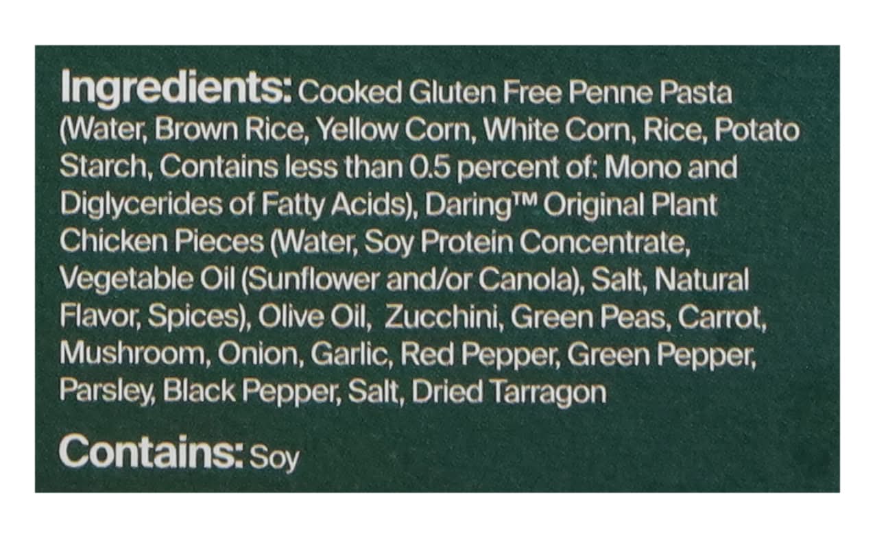 Ingredients: Cooked Gluten Free Penne Pasta (Water, Brown Rice, Yellow Corn, White Corn, Rice, Potato Starch, Contains Less than 0.5 Percent of: Mono and Diglycerides of Fatty Acids), Daring Original Plant Chicken Pieces (Water, Soy Protein Concentrate, Vegetable Oil (Sunflower and/or Canola), Salt, Natural Flavor, Spices), Olive Oil, Zucchini, Green Peas, Carrot, Mushroom, Onion, Garlic, Red Pepper, Green Pepper, Parsley, Black Pepper, Salt, Dried Tarragon Contains: Soybeans, Corn