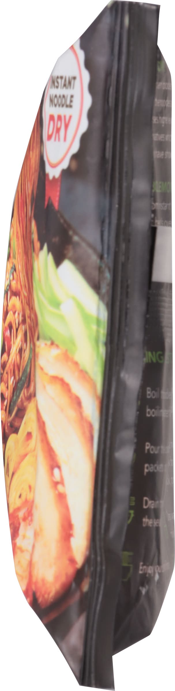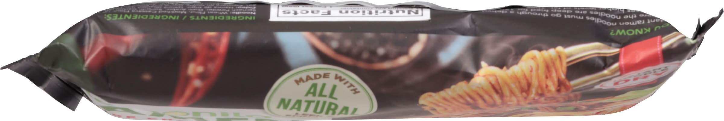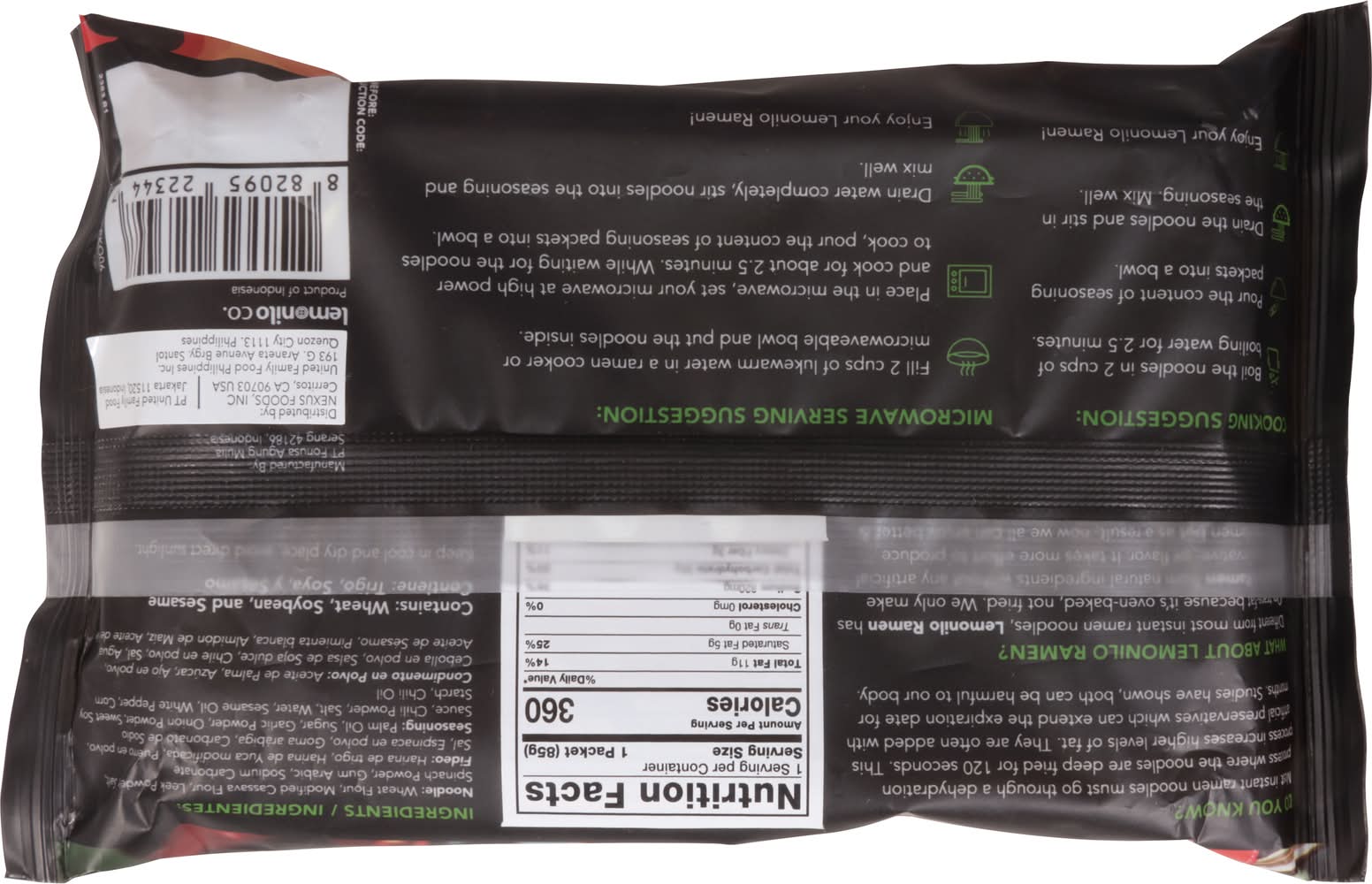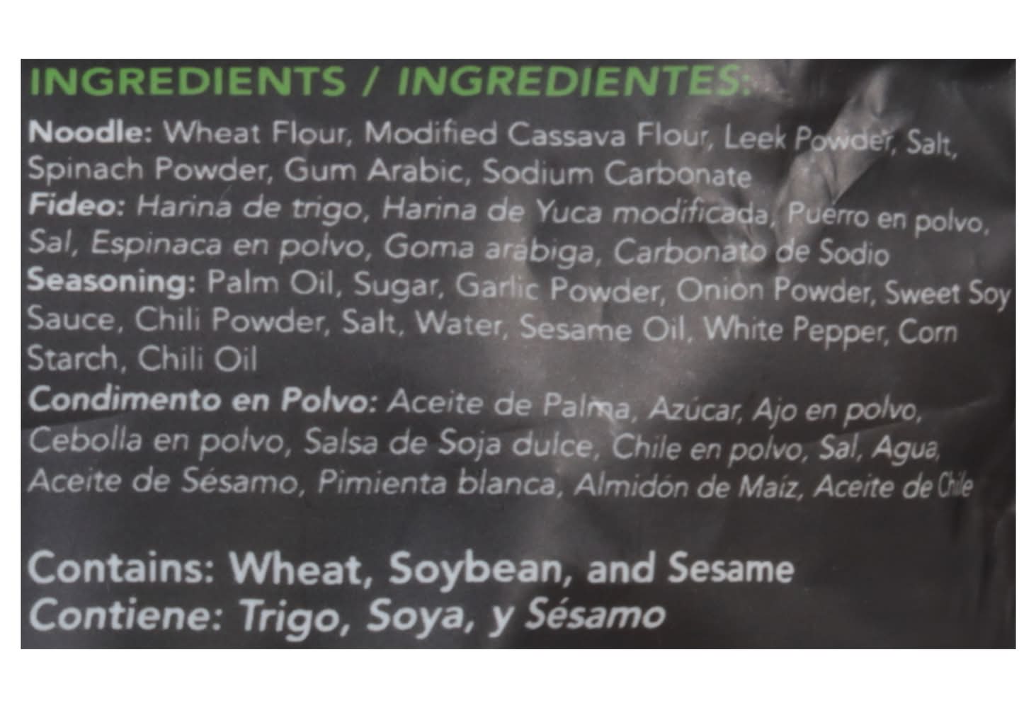 Ingredients: Noodle: Wheat Flour, Modified Cassava Flour, Leek Powder, Salt, Spinach Powder, Gum Arabic, Sodium Carbonate. Seasoning Powder: Palm Oil, Sugar, Garlic Powder, Onion Powder, Sweet Soy Sauce, Chili Powder, Salt, Water, Sesame Oil, White Pepper, Corn Starch, Chili Oil Contains: Wheat, Soybeans, Sesame, Corn