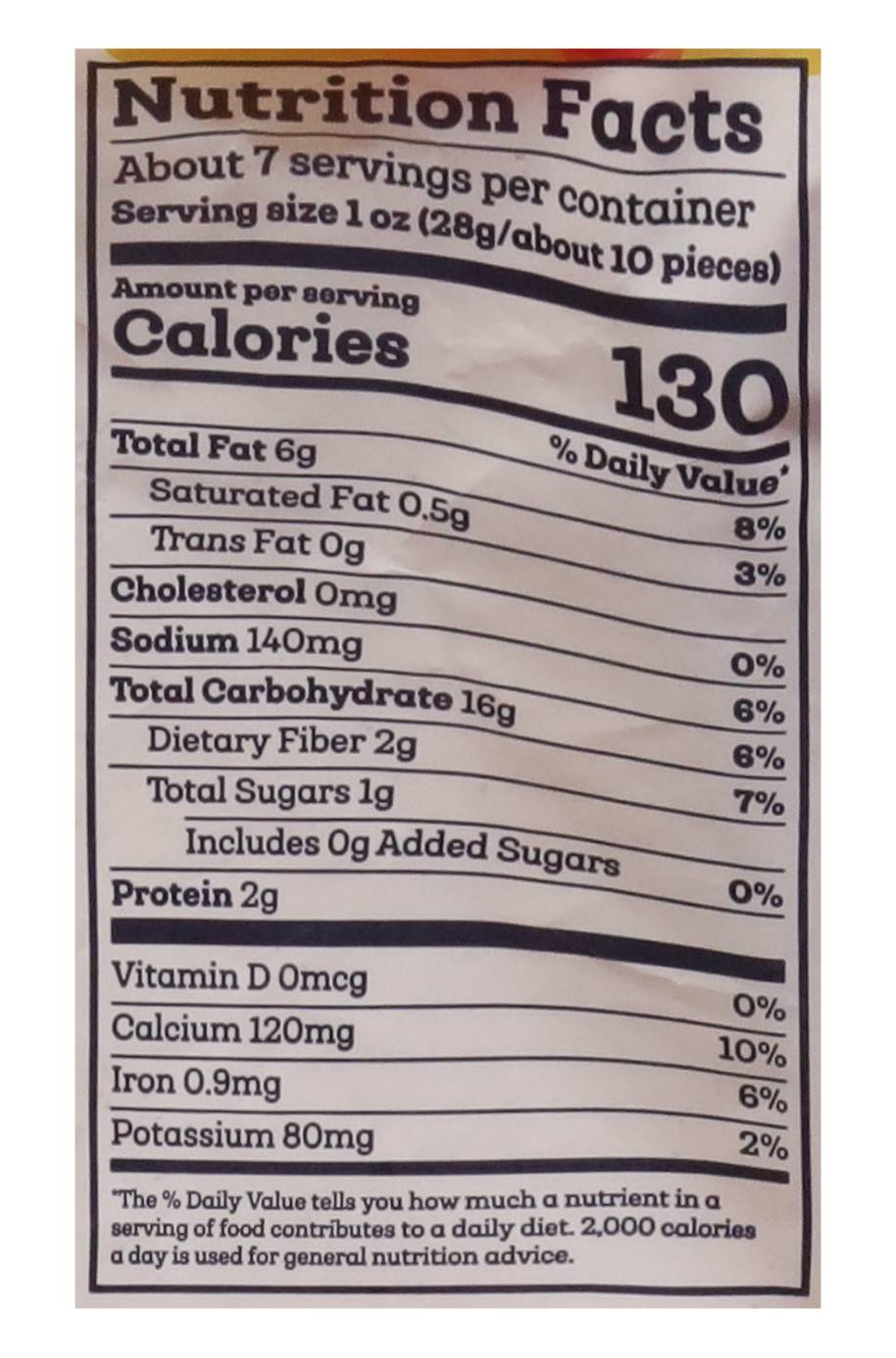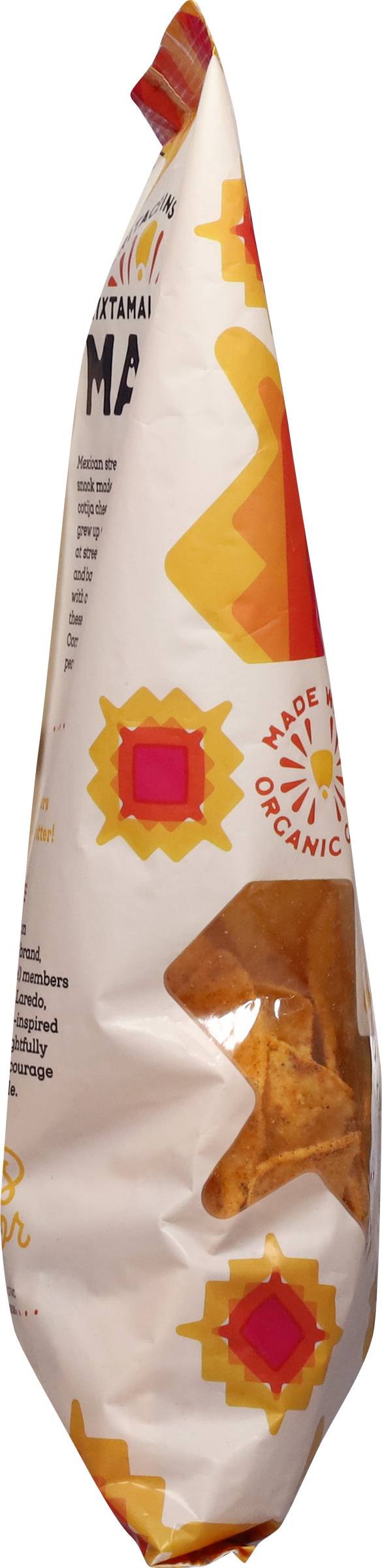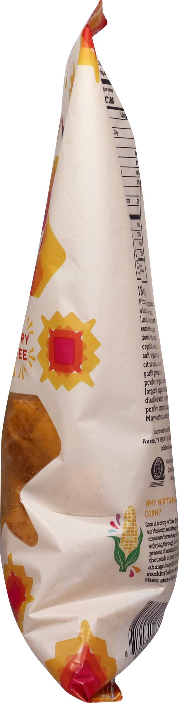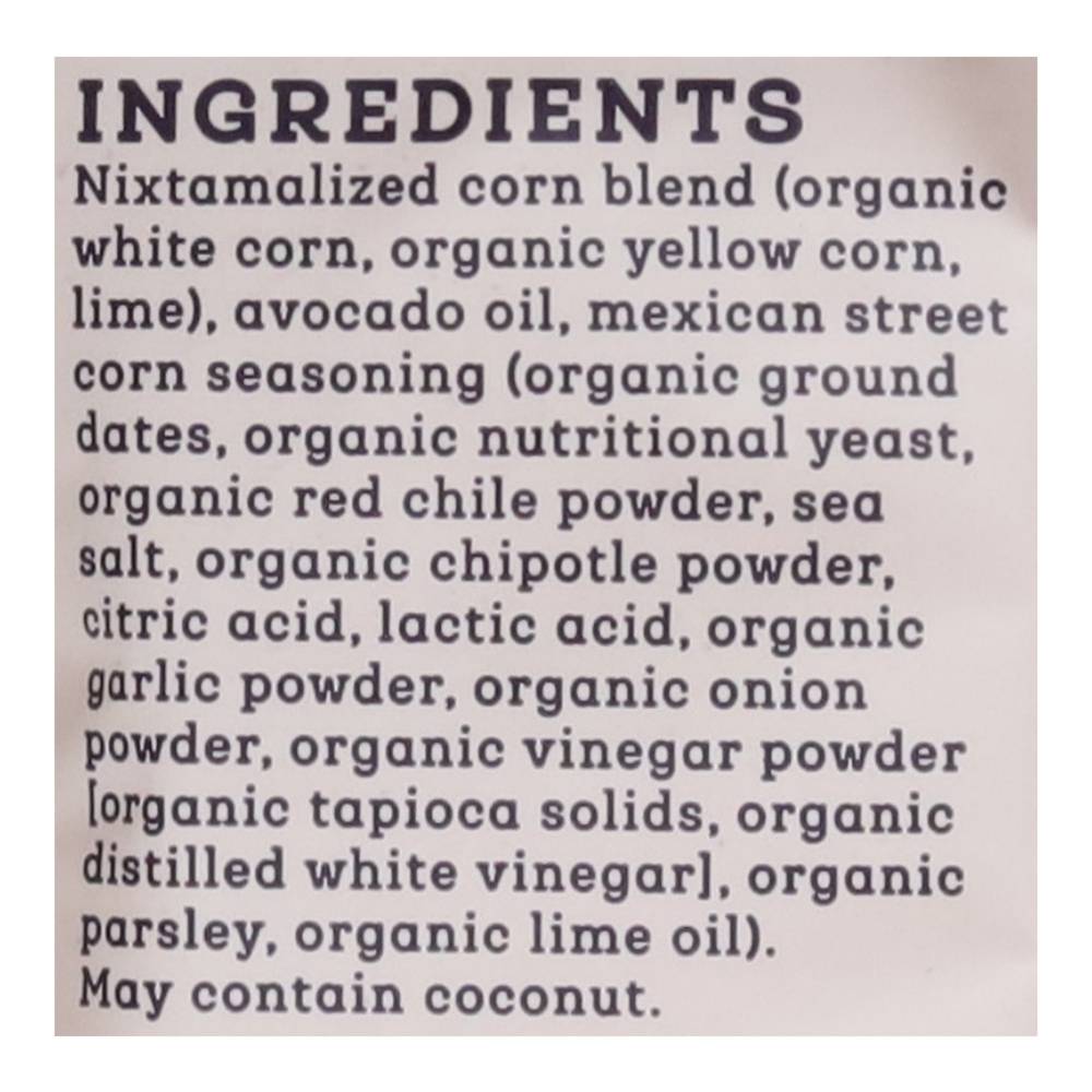 Ingredients: Nixtamalized Corn Blend (Organic White Corn, Organic Yellow Corn, Lime), Avocado Oil, Mexican Street Corn Seasoning (Organic Ground Dates, Organic Nutritional Yeast, Organic Red Chile Powder, Sea Salt, Organic Chipotle Powder, Citric Acid, Lactic Acid, Organic Garlic Powder, Organic Onion Powder, Organic Vinegar Powder [Organic Tapioca Solids, Organic Distilled White Vinegar], Organic Parsley, Organic Lime Oil) Contains: Tree Nuts, Coconuts