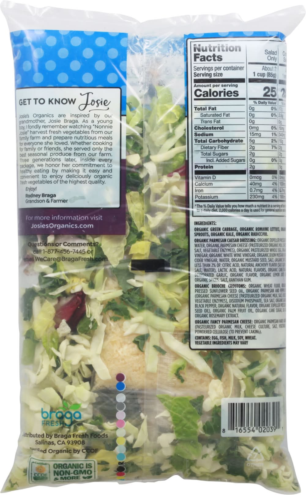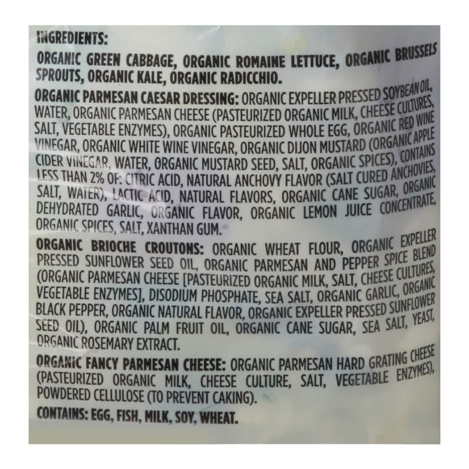 Ingredients: Organic Brioche Croutons: Organic Brioche Croutons: Organic Wheat Flour, Organic Expeller Pressed Sunflower Seed Oil, Organic Parmesan and Pepper Spice Blend (Organic Parmesan Cheese [Pasteurized Organic Milk, Salt, Cheese Cultures, Vegetable Enzymes], Disodium Phosphate, Sea Salt, Organic Garlic, Organic Black Pepper, Organic Natural Flavor, Organic Expeller Pressed Sunflower Seed Oil), Organic Palm Fruit Oil, Organic Cane Sugar, Sea Salt, Yeast, Organic Rosemary Extract. Organic Parmesan Caesar Dressing: Organic Parmesan Caesar Dressing: Organic Expeller Pressed Soybean Oil, Water, Organic Parmesan Cheese (Pasteurized Organic Milk, Cheese Cultures, Salt, Vegetable Enzymes), Organic Pasteurized Whole Egg, Organic Red Wine Vinegar, Organic White Wine Vinegar, Organic Dijon Mustard (Organic Apple Cider Vinegar, Water, Organic Mustard Seed, Salt, Organic Spices), Contains Less than 2% of: Citric Acid, Natural Anchovy Flavor (Salt Cured Anchovies, Salt, Water) Lactic Acid, Natural Flavors, Organic Cane Sugar, Organic Dehydrated Garlic Flavor, Organic Lemon Juice Concentrate, Organic Spices, Salt, Xanthan Gum. Salad Only: Organic Green Cabbage, Organic Romaine Lettuce, Organic Brussels Sprouts, Organic Kale, Organic Radicchio. Organic Fancy Parmesan Cheese: Organic Fancy Parmesan Cheese: Organic Parmesan Hard Grating Cheese (Pasteurized Organic Milk, Cheese Culture, Salt, Vegetable Enzymes), Powdered Cellulose (to Prevent Caking). Contains: Eggs, Fish, Wheat, Milk, Soybeans, Mustard, Fish, Anchovy