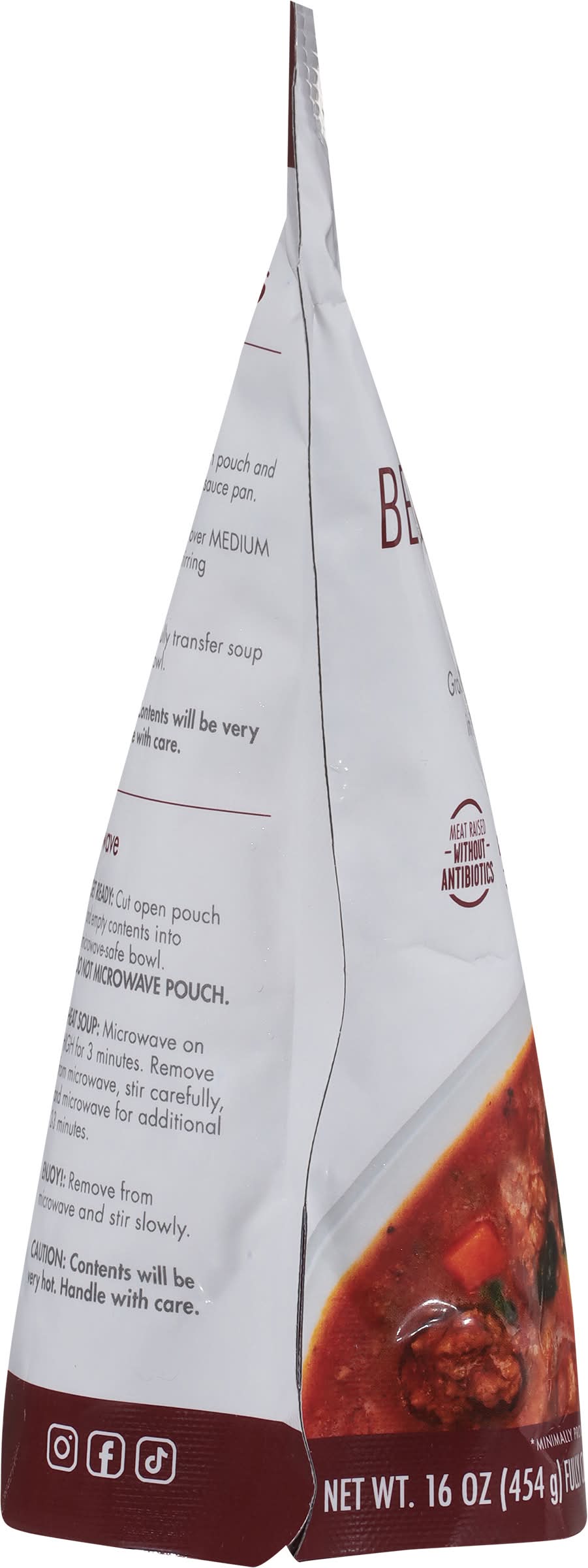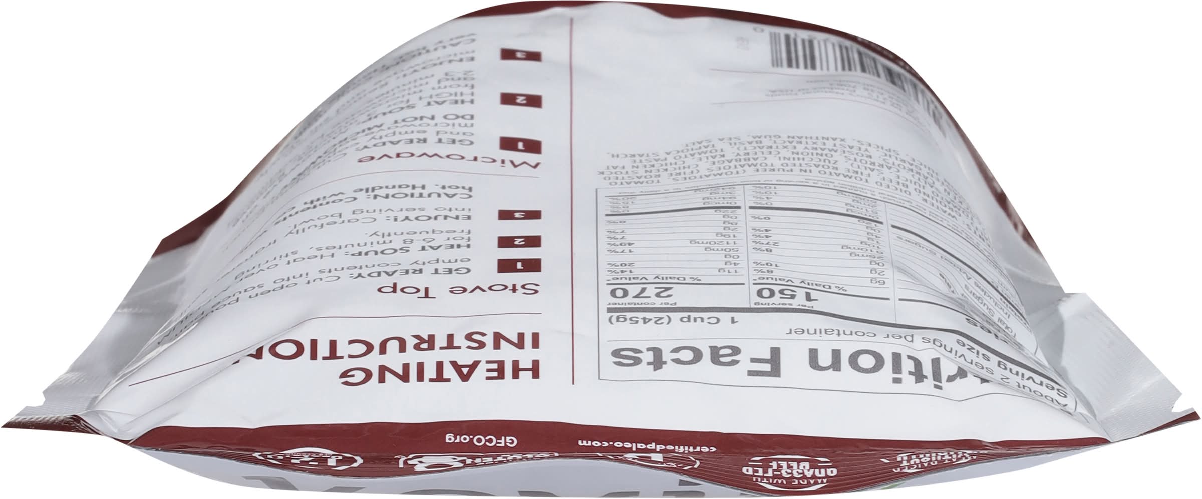 Directions for use: Heating Instructions: Stove Top: Get Ready: 1. Cut open pouch and empty contents into sauce pan. 2. Heat Soup: Heat over medium for 6-8 minutes, stirring frequently. 3. Enjoy!: Carefully transfer soup into serving bowl. Microwave: 1. Get Ready: Cut open pouch and empty contents into microwave-safe bowl. 2. Heat Soup: Microwave on high for 3 minutes. Remove from microwave, stir carefully and microwave for additional 2-3 minutes. 3. Enjoy!: Remove from microwave and stir slowly. Caution: Contents will be very hot. Handle with care. Perishable - keep refrigerated. Storage recommendation: Perishable - keep refrigerated.
