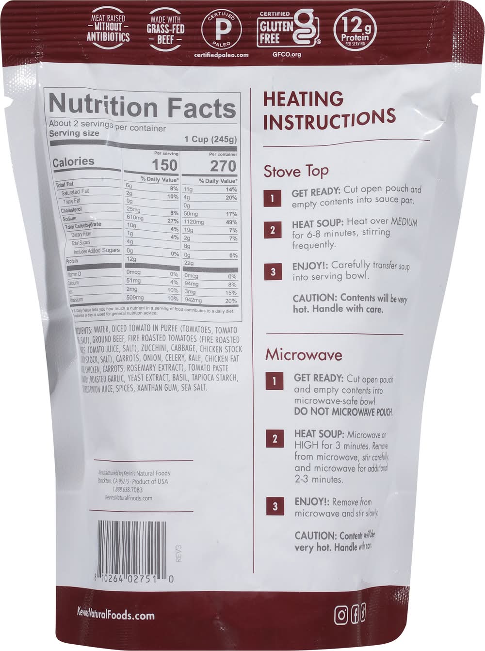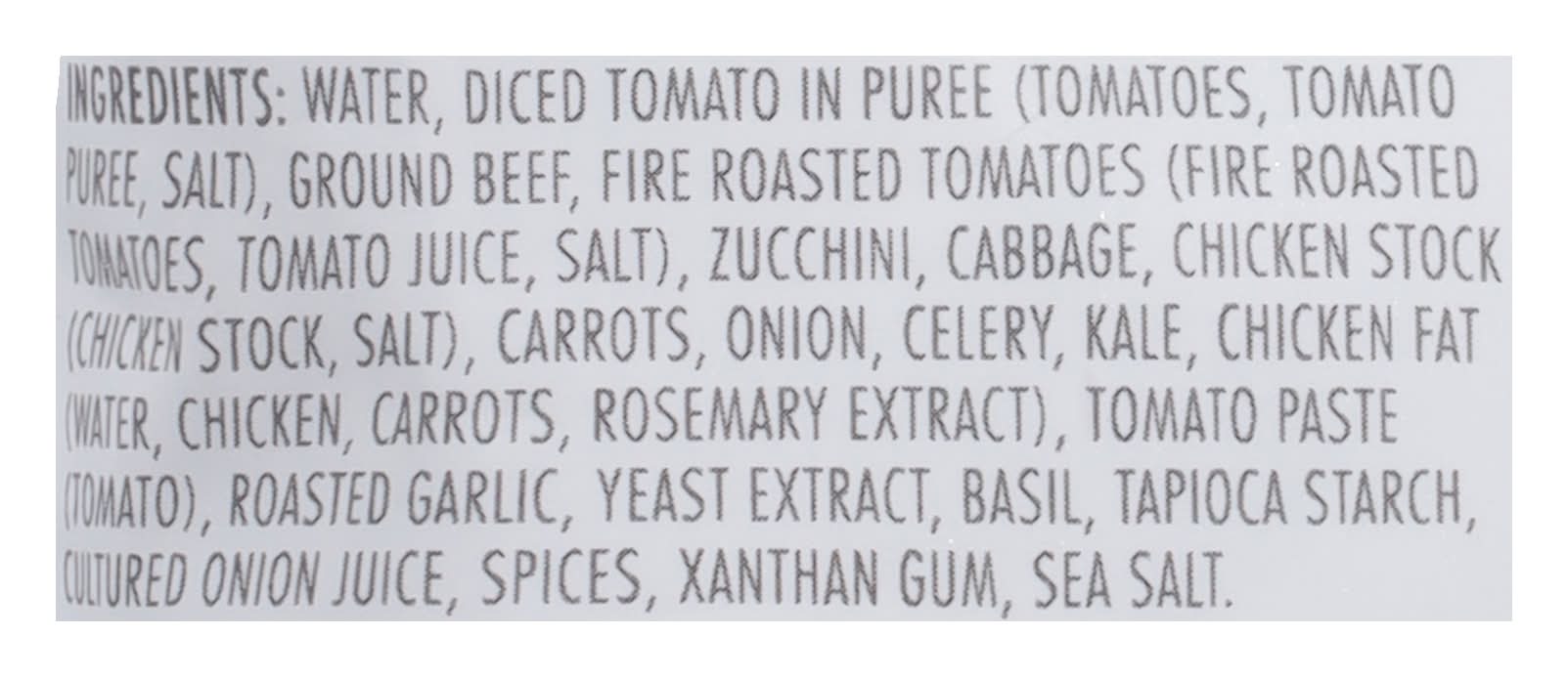Ingredients: Water, Diced Tomato in Puree (Tomatoes, Tomato Puree, Salt), Ground Beef, Fire Roasted Tomatoes (Fire Roasted Tomatoes, Tomato Juice, Salt), Zucchini, Cabbage, Chicken Stock (Chicken Stock, Salt), Carrots, Onion, Celery, Kale, Chicken Fat (Water, Chicken, Carrots, Rosemary Extract), Tomato Paste (Tomato), Roasted Garlic, Yeast Extract, Basil, Tapioca Starch, Cultured Onion Juice, Spices, Xanthan Gum, Sea Salt Contains: Celery