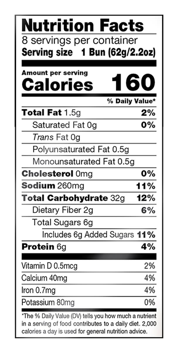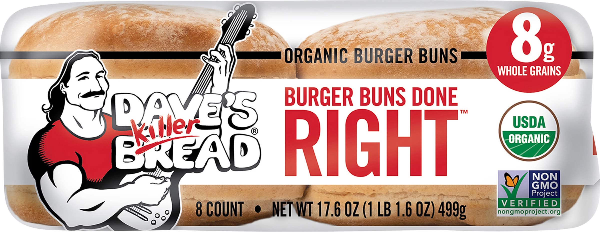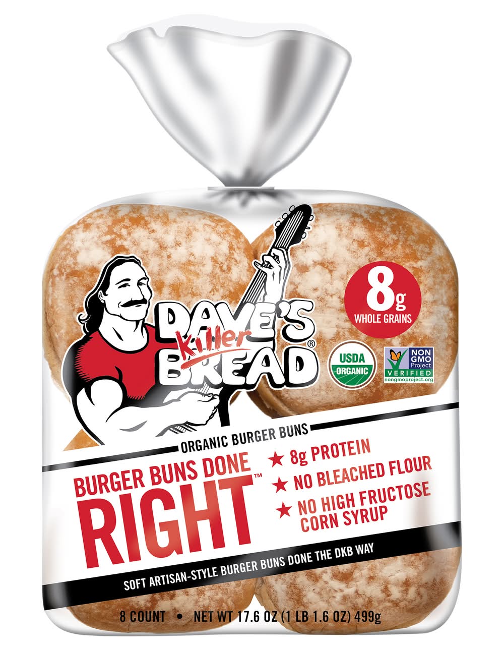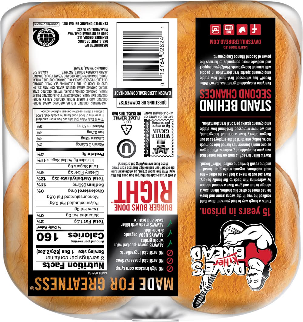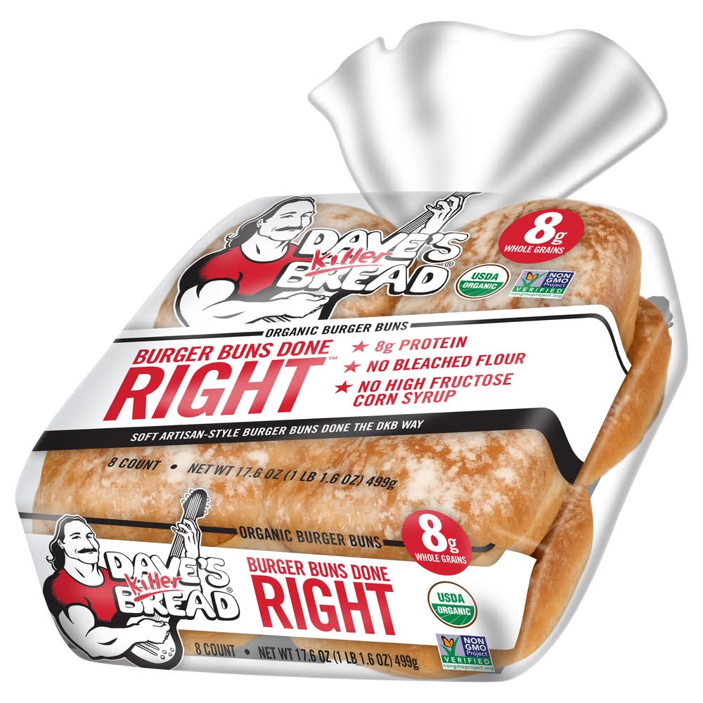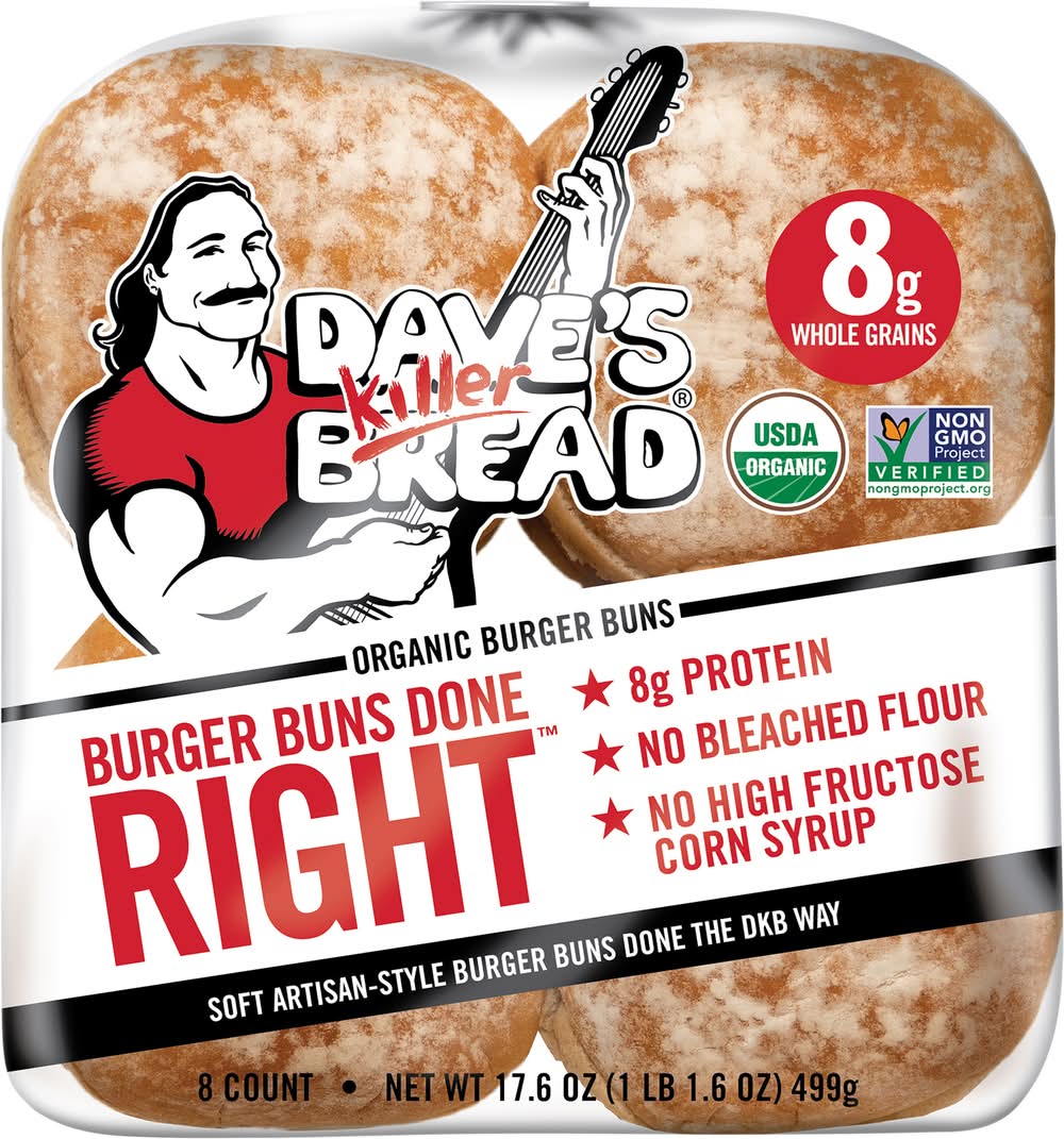 Burger Buns Done Right A soft artisan-style hamburger bun done the DKB way! With five super grains, 8g whole grains, no bleached flour and no high fructose corn syrup these buns are anything but ordinary Packaging: Reusable