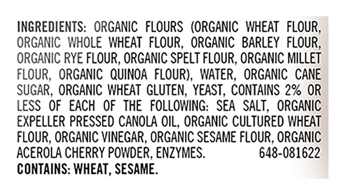 Ingredients: Organic Flours (Organic Wheat Flour, Organic Whole Wheat Flour, Organic Barley Flour, Organic Rye Flour, Organic Spelt Flour, Organic Millet Flour, Organic Quinoa Flour), Water, Organic Cane Sugar, Organic Wheat Gluten, Yeast, Contains 2% or Less of Each of the Following: Sea Salt, Organic Expeller Pressed Canola Oil, Organic Cultured Wheat Flour, Organic Vinegar, Organic Sesame Flour, Organic Acerola Cherry Powder, Enzymes Contains: Wheat, Sesame, Barley, Gluten