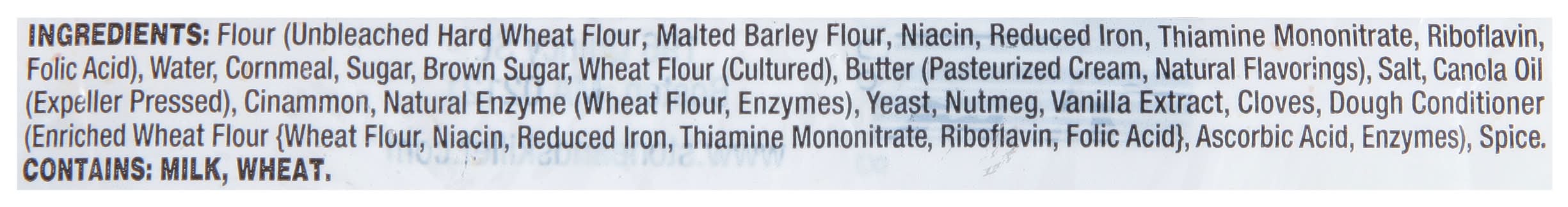 Ingredients: Flour (Unbleached Hard Wheat Flour, Malted Barley Flour, Niacin, Reduced Iron, Thiamine Mononitrate, Riboflavin, Folic Acid), Water, Cornmeal, Sugar, Brown Sugar, Wheat Flour (Cultured), Butter (Pasteurized Cream, Natural Flavorings), Salt, Canola Oil (Expeller Pressed), Cinammon, Natural Enzyme (Wheat Flour, Enzymes), Yeast, Nutmeg, Vanilla Extract, Cloves, Dough Conditioner (Enriched Wheat Flour {Wheat Flour, Niacin, Reduced Iron, Thiamine Mononitrate, Riboflavin, Folic Acid}, Ascorbic Acid, Enzymes), Spice Contains: Milk, Wheat, Barley, Corn