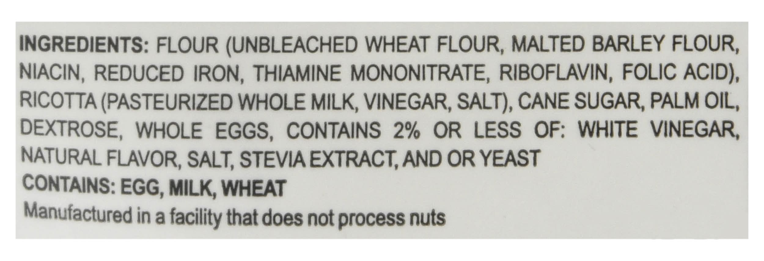 Ingredients: Flour (Unbleached Wheat Flour, Malted Barley Flour, Niacin, Reduced Iron, Thiamine Mononitrate, Riboflavin, Folic Acid), Ricotta (Pasteurized Whole Milk, Vinegar, Salt), Cane Sugar, Palm Oil, Dextrose, Whole Eggs, Contains 2% or Less of: White Vinegar, Natural Flavor, Salt, Stevia Extract, and or Yeast Contains: Eggs, Milk, Wheat, Barley