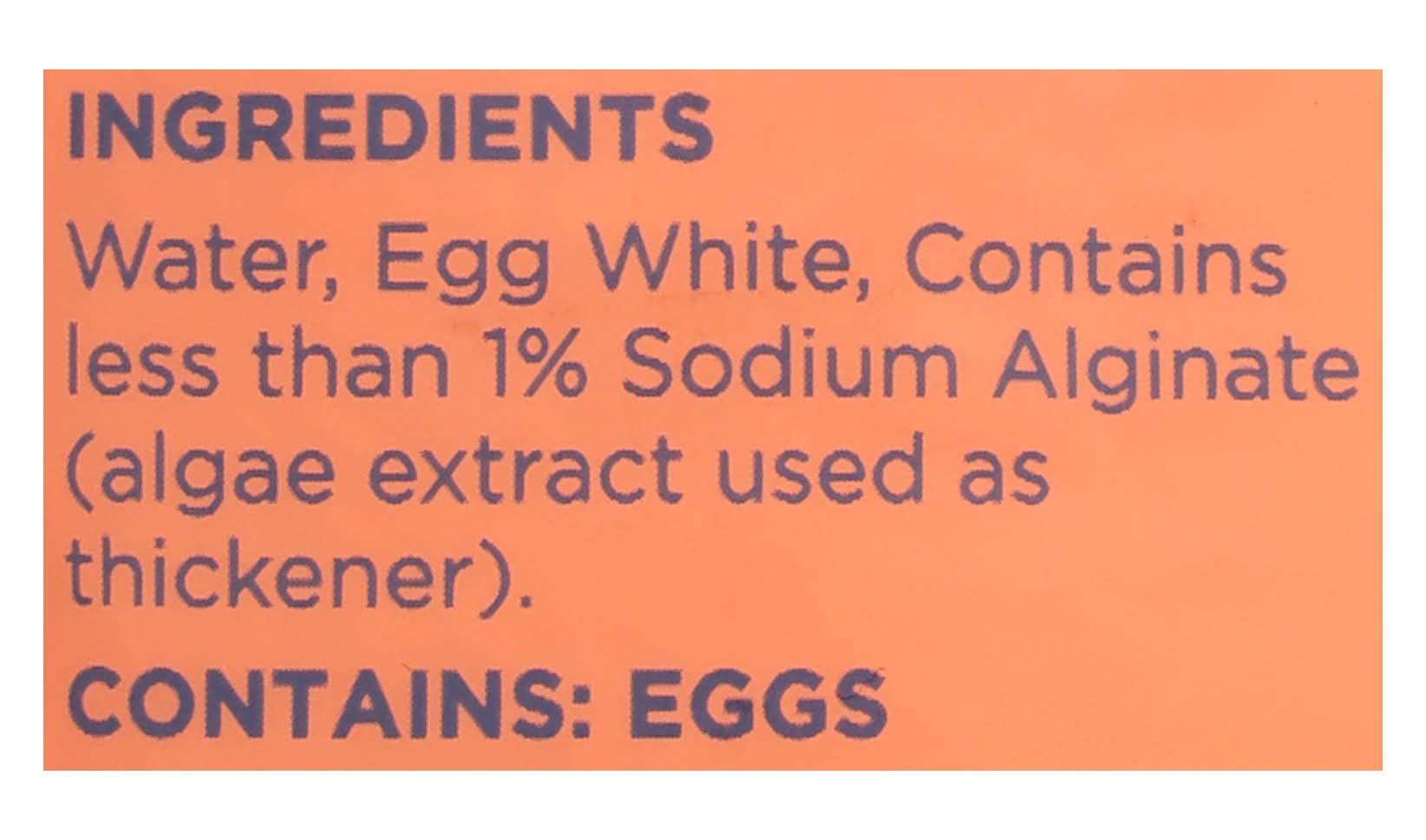 Ingredients: Water, Egg White, Contains Less than 1% Sodium Alginate (Algae Extract Used as Thickener) Contains: Eggs