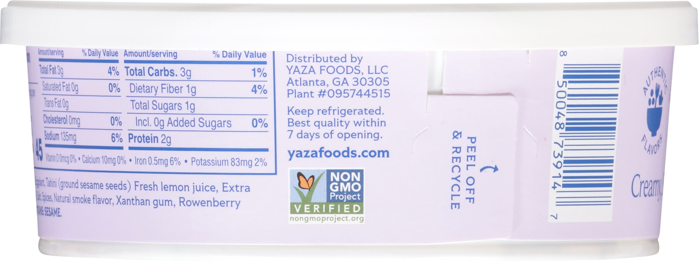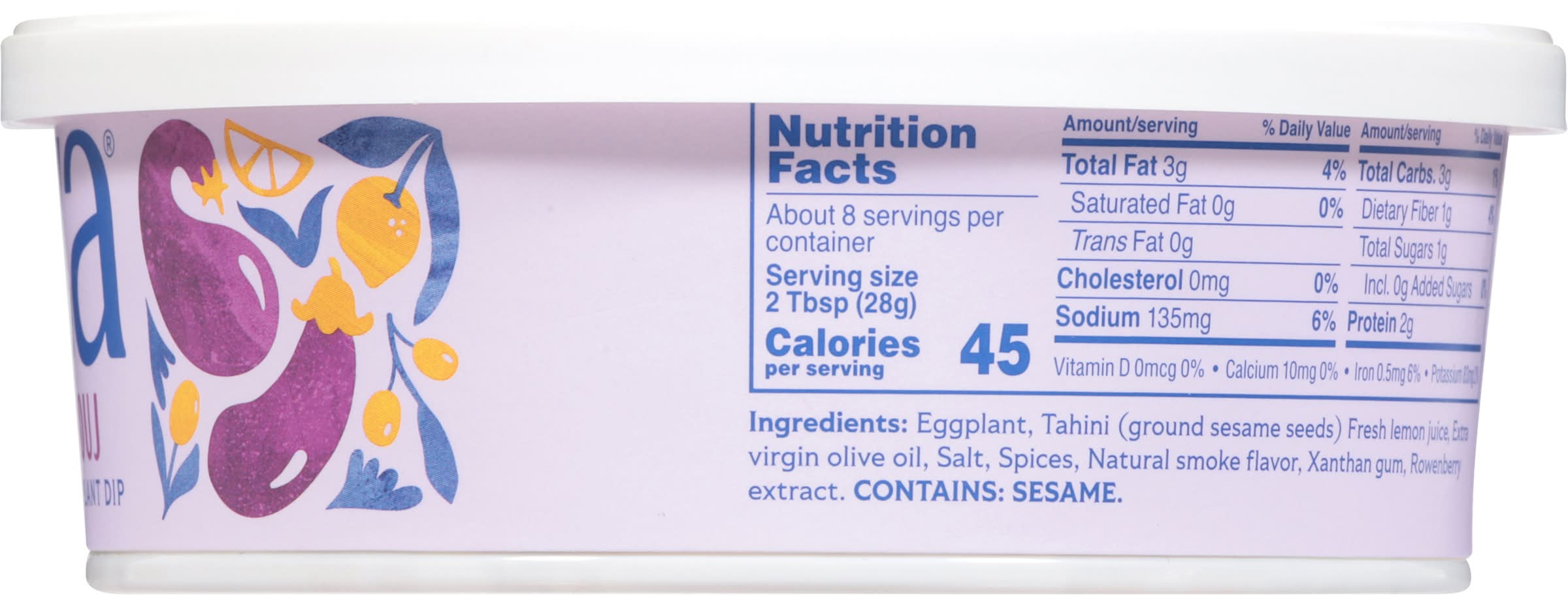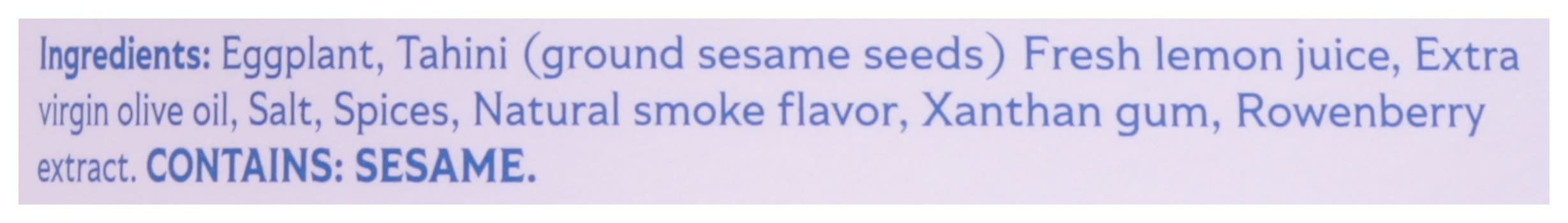 Ingredients: Eggplant, Tahini (Ground Sesame Seeds) Fresh Lemon Juice, Extra Virgin Olive Oil, Salt, Spices, Natural Smoke Flavor, Xanthan Gum, Rowenberry Extract Contains: Sesame