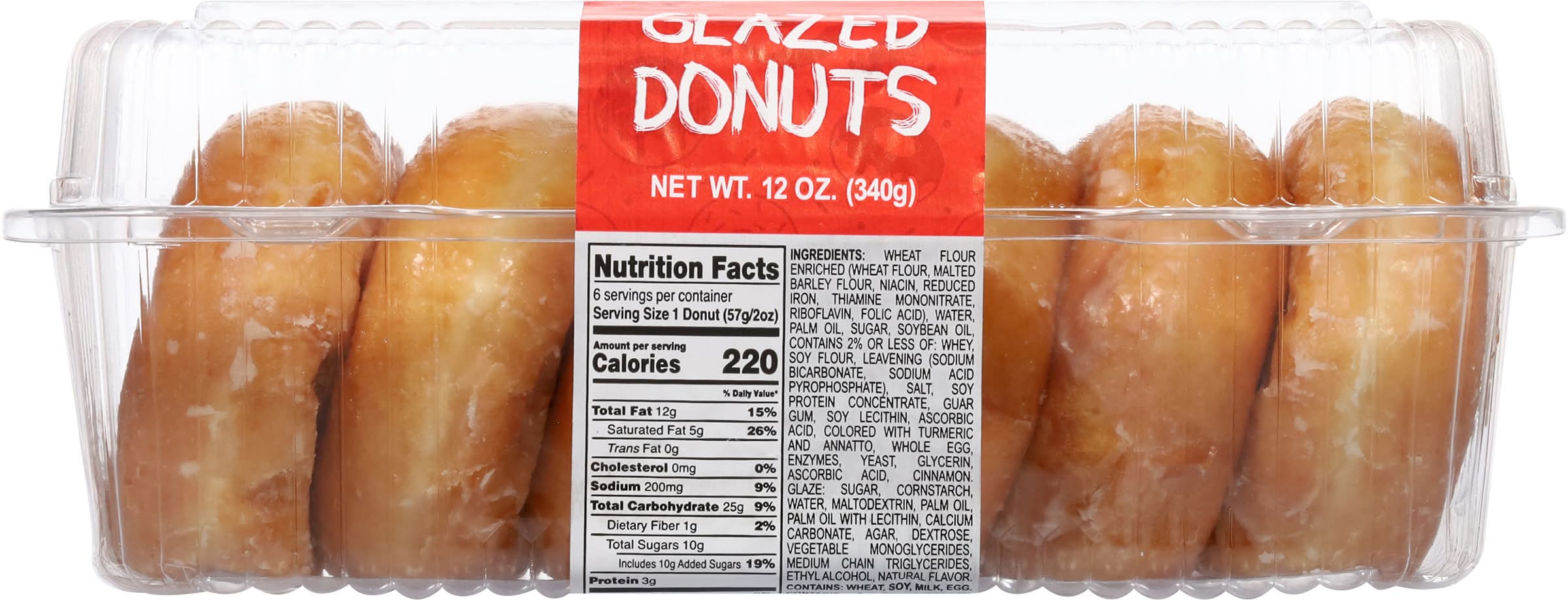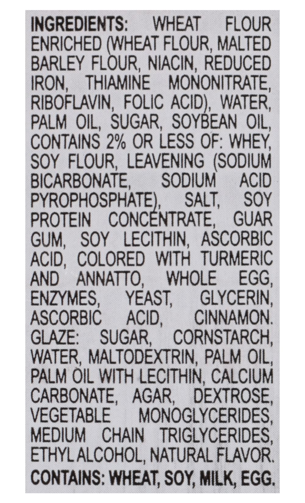 Ingredients: Wheat Flour Enriched (Wheat Flour, Malted Barley Flour, Niacin, Reduced Iron, Thiamine Mononitrate, Riboflavin, Folic Acid), Water, Palm Oil, Sugar, Soybean Oil, Contains 2% or Less of: Whey, Soy Flour, Leavening (Sodium Bicarbonate, Sodium Acid Pyrophosphate), Salt, Soy Protein Concentrate, Guar Gum, Soy Lecithin, Ascorbic Acid, Colored with Turmeric and Annatto, Whole Egg, Enzymes, Yeast, Glycerin, Ascorbic Acid, Cinnamon, Glaze: Sugar, Cornstarch, Water, Maltodextrin, Palm Oil, Palm Oil with Lecithin, Calcium Carbonate, Agar, Dextrose, Vegetable Monoglycerides, Medium Chain Triglycerides, Ethyl Alcohol, Natural Flavor Contains: Wheat, Soybeans, Milk, Eggs, Barley