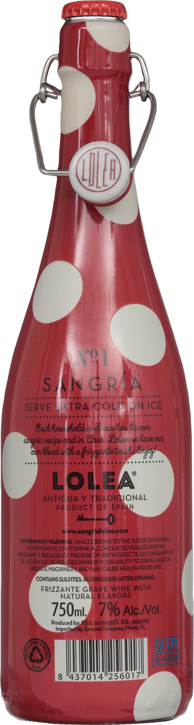 All natural. Frizzante grape wine with natural flavors. Each household in Spain has its own sangria recipe and in Casa Lolea we have our own blend with a frizzante touch. Enjoy! Remove sleeve & recycle glass. Produced by: RGS: 30.11030/Z. Product of Spain. Alcohol by volume: 7%