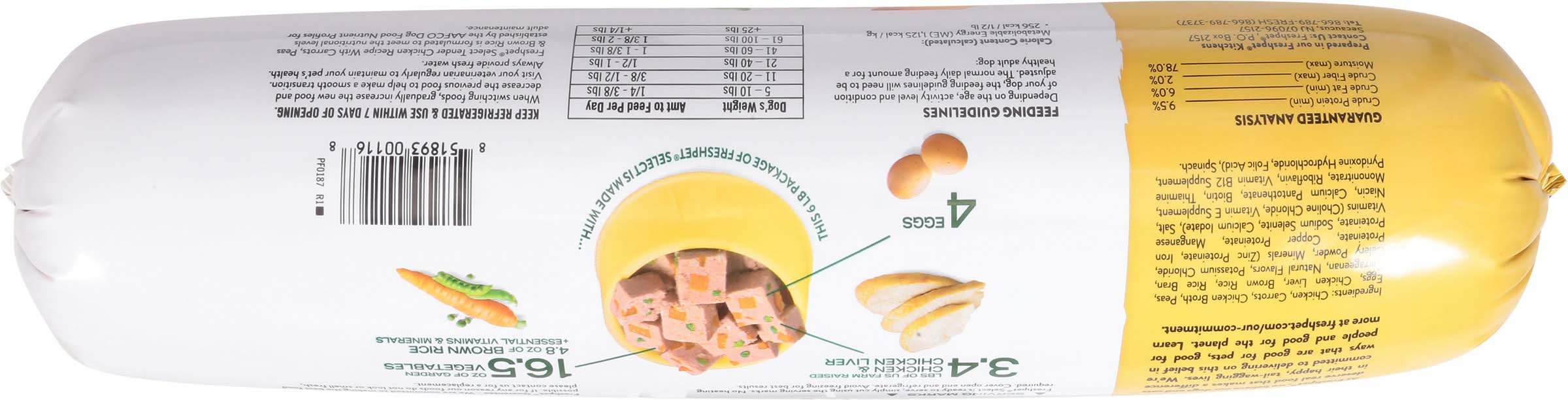 With carrots, peas and brown rice. Fresh. Real food from the fridge. Natural U.S farm raised chicken. No meat meals or by product meals, Never any preservatives. When switching foods, gradually increase the new food and decrease the previous food to help make a smooth transition. Visit your veterinarian regularly to maintain your pet's health. Always provide fresh water. At freshpet, we believe our dogs and cats deserve real food that makes a difference in their happy, tail-wagging lives. We're committed to delivering on this belief in ways that are good for pets, good for people and good for the planet. If for any reason our foods do not look or smell fresh, please contact us for a replacement. Freshpet, PO Box 2157,Secaucus,Nj