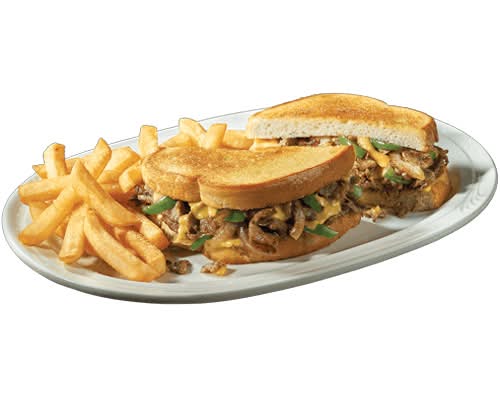 Grilled sirloin steak sliced thin and topped with sautéed green peppers and onions with melted American cheese on just-off-the-grill sourdough bread. (1010 Calories)