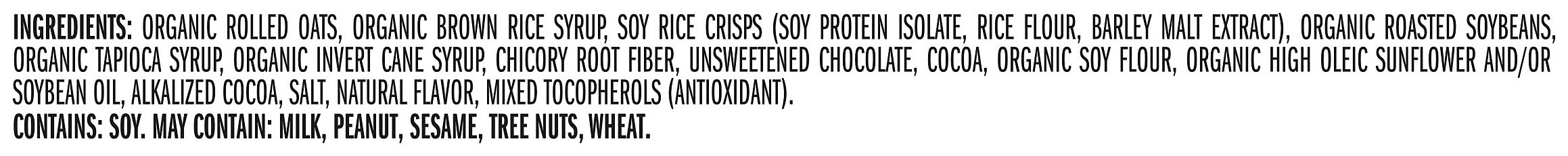 Ingredients: INGREDIENTS: ORGANIC ROLLED OATS, ORGANIC BROWN RICE SYRUP, SOY RICE CRISPS (SOY PROTEIN ISOLATE, RICE FLOUR, BARLEY MALT EXTRACT), ORGANIC ROASTED SOYBEANS, ORGANIC TAPIOCA SYRUP, ORGANIC INVERT CANE SYRUP, CHICORY ROOT FIBER, UNSWEETENED CHOCOLATE, COCOA, ORGANIC SOY FLOUR, ORGANIC HIGH OLEIC SUNFLOWER AND, OR SOYBEAN OIL, ALKALIZED COCOA, SALT, NATURAL FLAVOR, MIXED TOCOPHEROLS (ANTIOXIDANT), . CONTAINS: SOY. MAY CONTAIN: MILK, PEANUT, SESAME, TREE NUTS, WHEAT. Contains: CONTAINS: SOY.MAY CONTAIN: MILK, PEANUT, SESAME, TREE NUTS, WHEAT.