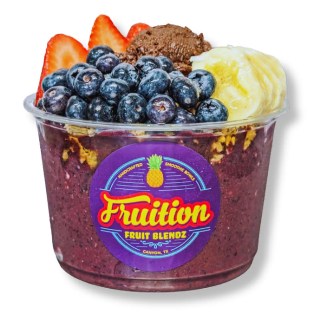 The Bowl that separates Fruition from the rest with our House-made Chocolate Peanut Butter that compliments the perfect blend of Acai. Blend: Organic Açaí blended w. Strawberries, Banana and Apple Juice. Toppings: Chocolate Hazelnut Granola, Banana, Strawberries, Blueberries, House-made Chocolate Peanut Butter and Honey. Protein 24g/ Fats 34g/ Carbs 172g