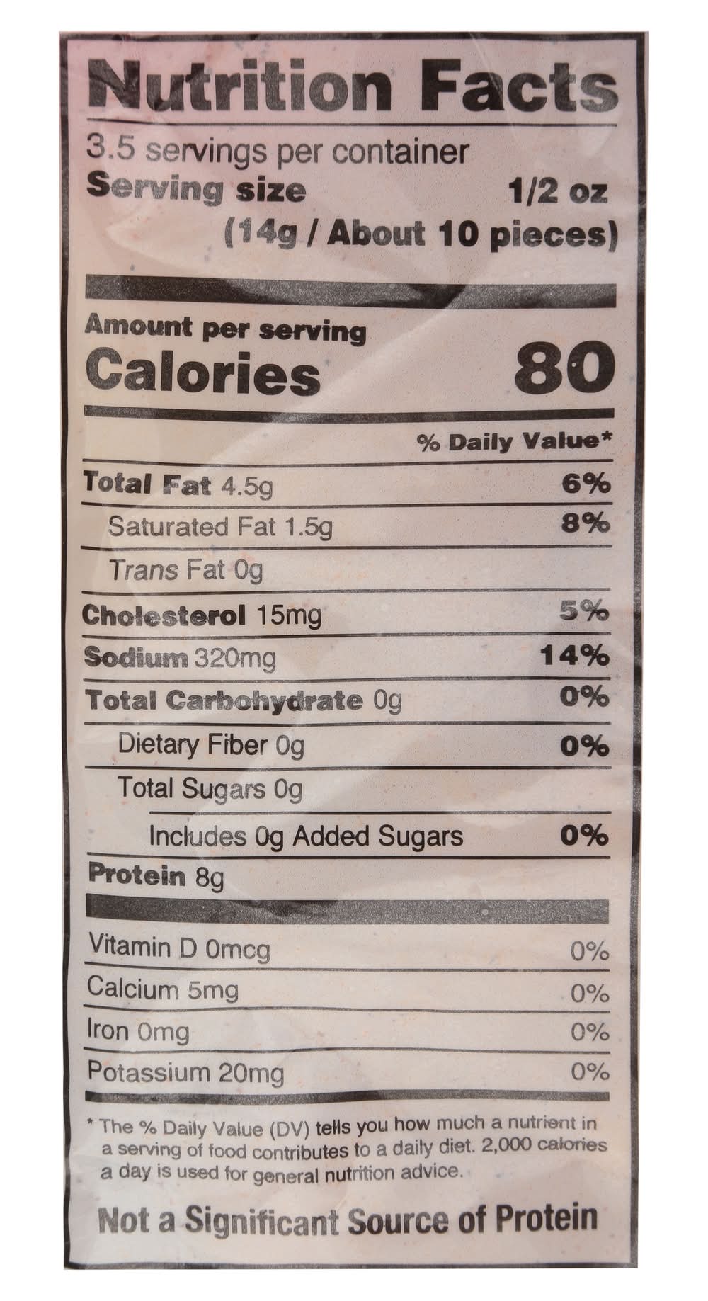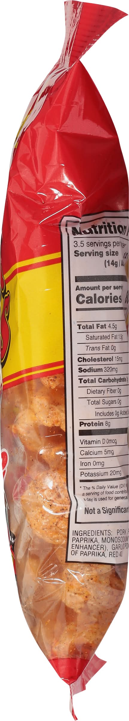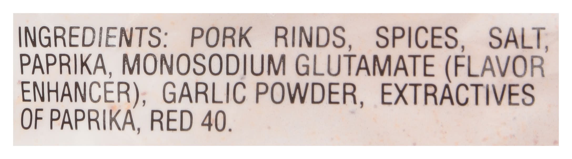 Ingredients: Pork Rinds, Spices, Salt, Paprika, Monosodium Glutamate (Flavor Enhancer); Garlic Powder, Extractives of Paprika, Red 40