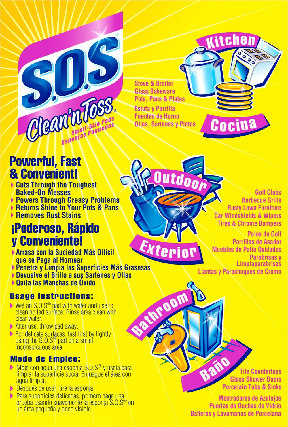 Usage instruction: wet s.o.s. pad with water, clean solid surface. rinse area clean with clear water. after use, throw pad away. for delicate surfaces, test first by lightly using the sos pad on a small, inconspicuous area. lift tab to open.