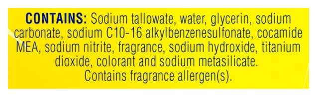Ingredients: Sodium Tallowate, Water, Glycerin, Sodium Carbonate, Sodium C10-16 Alkylbenzenesulfonate, Cocamide MEA, Sodium Nitrite, Fragrance, Sodium Hydroxide, Titanium Oxide, Colorant and Sodium Metasilicate