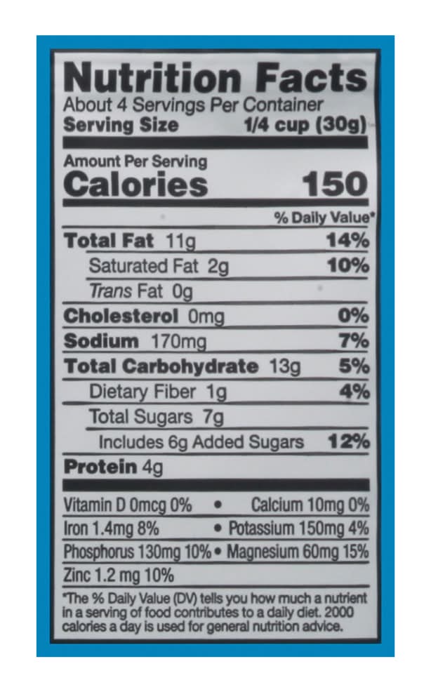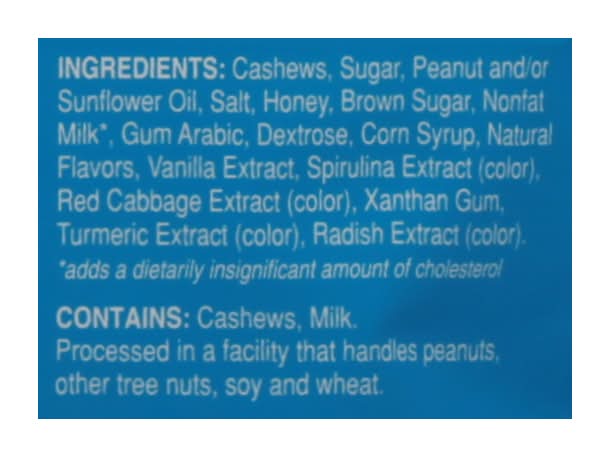 Ingredients: Cashews, Sugar, Peanut and/or Sunflower Oil, Salt, Honey, Brown Sugar, Nonfat Milk (Adds a Dietarily Insignificant Amount of Cholesterol), Gum Arabic, Dextrose, Corn Syrup, Natural, Flavors, Vanilla Extract, Spirulina Extract (Color), Red Cabbage Extract (Color), Xanthan Gum, Turmeric Extract (Color), Radish Extract (Color) Contains: Tree Nuts, Cashews, Peanuts, Milk, Corn, Peanuts, Tree Nuts, Soybeans, Wheat