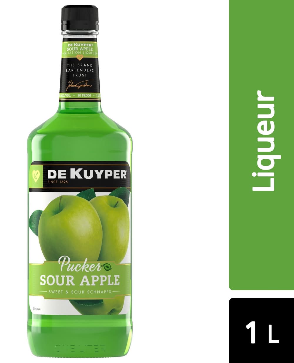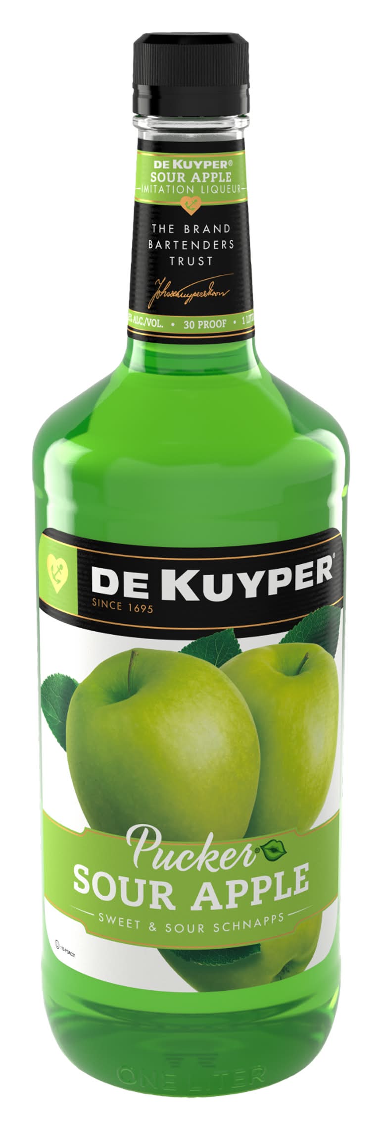DeKuyper Pucker Sour Apple Schnapps Liqueur puts the sour apple in the world famous Sour Appletini. Add a splash of bold flavor to your cocktails with this fruity liqueur. A sweet and sour sensation, this liqueur bursts with sweetness followed by a mouth-puckering sourness. Great for mixing, Pucker Sour Apple makes a great foundation for green apple inspired martinis, punches, daiquiris, and more. Since 1695, DeKuyper has been the brand bartenders trust to add color, flavor, and fun to any cocktail. Alcohol by volume: 15%