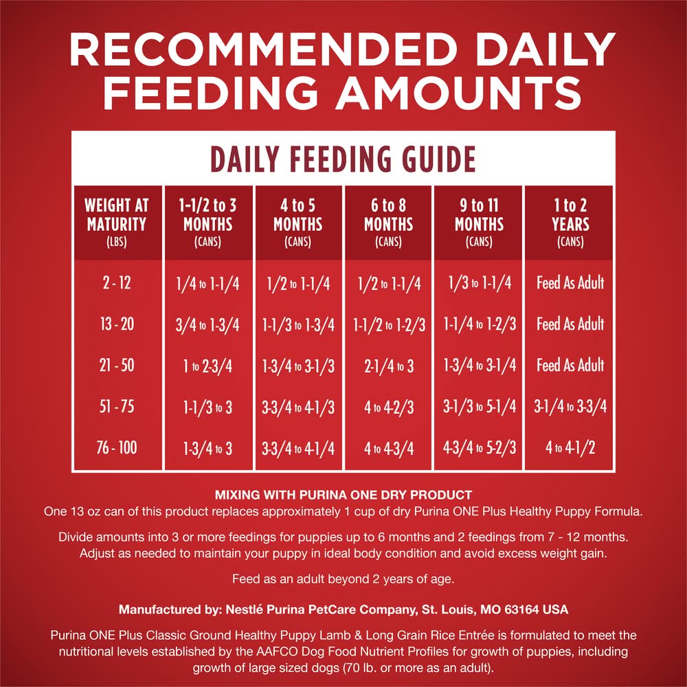 Directions for use: Recommended Daily Feeding Amounts. Amount to Feed (Cans): Weight at Maturity: 3-12 lbs; 1 to 1/2-3 Months: 1/2-3/4; 4-5 Months: 3/4-1; 6-8 Months: 1/2-1-1/4; 9-11 Months: Feed as adult; 1-2 Years: Feed as Adult. Weight at Maturity: 13-20 lbs; 1-1/2-3 Months: 1/2-1; 4-5 Months: 1-1/4;1-1/2; 6-8 Months: 3/4-1; 9-11 Months: 1-1/8-1-1/4; 1-2 Years: 1-1-1/3. Weight of Maturity: 21-50 lbs; 1-1/2-3 Months: 1/2-1-1/4; 6-8 Months: 1-2/3-2-1/4; 6-8 Months: 1-1/4-2; 9-11 Months: 2-1/8-2-1/3; 1-2 Years: 2-1/4-3-1/4. Weight at Maturity: 51-75 lbs; 1-1/2-3 Months: 2/3-2; 4-5 Months: 21-2/3-3-1/8; 7-8 Months: 1-1/2-3; 9-11 Months: 2-2/3-3-3/4; 1-2 Years: 2-3/4-5. Weight at Maturity: 76-100 lbs; 1-1/2-3 Months: 1-2-1/8; 4-5 Months: 2-1/4-3; 6-8 Months: 3-1/8-5; 9-11 Months: 3-1/8-5; 9-11 Months: 4-1/4-5-1/2; 1-2 Years: 6-1/8-8-3/4. Mixing with One Dry Product: One 13 oz can of this product replaces approximately 1 cup of dry One Healthy Puppy Formula. Divide amounts into 3 or more feedings for puppies up to 6 months and 2 feedings from 7-12 months. Adjust as needed to maintain your puppy in ideal body condition and avoid excess weight gain. Refrigerate unused portion. Storage recommendation: Refrigerate unused portion.
