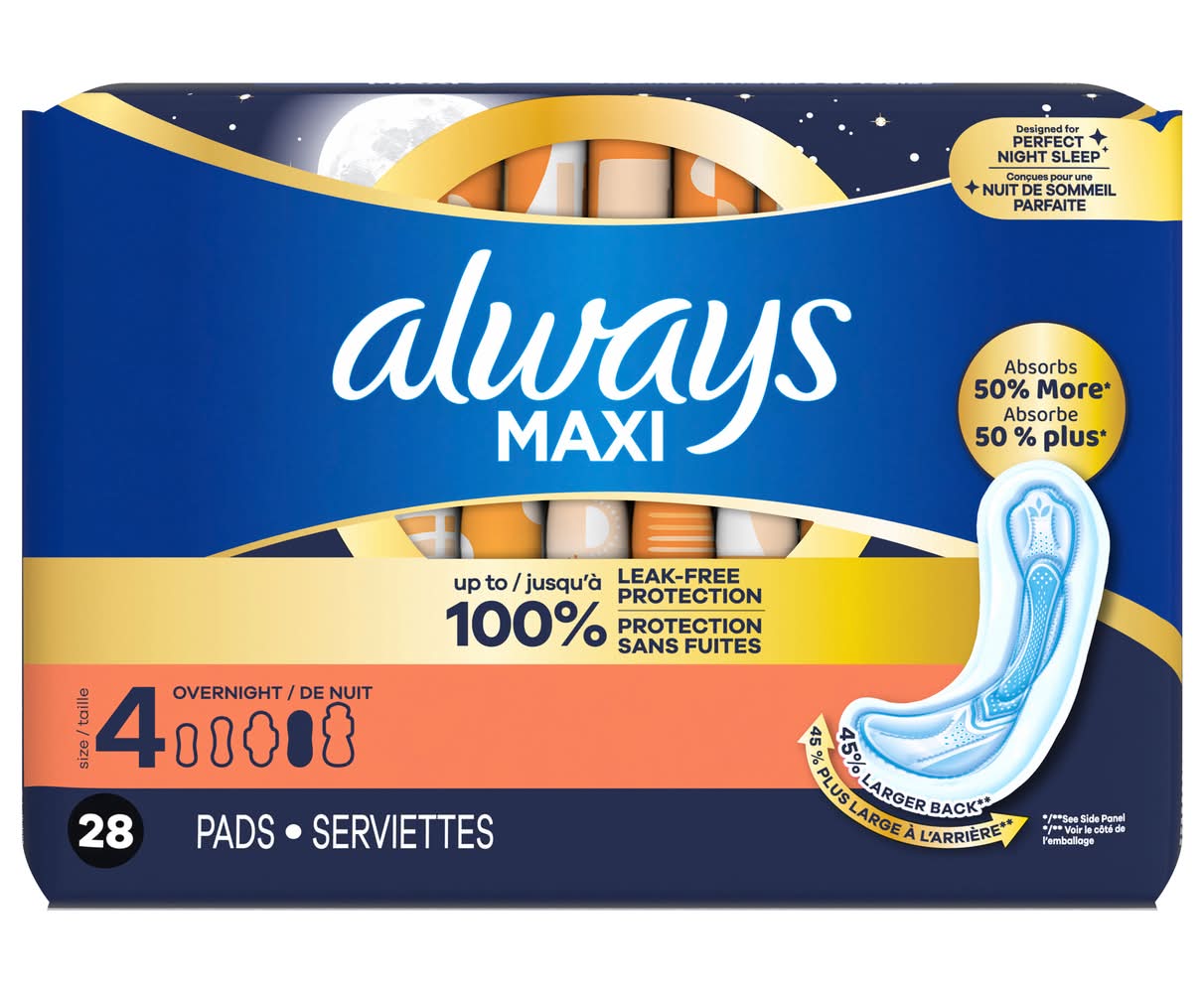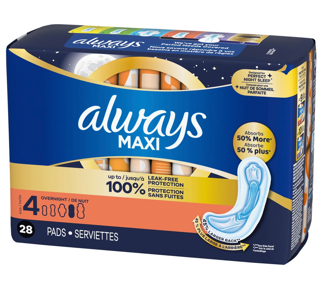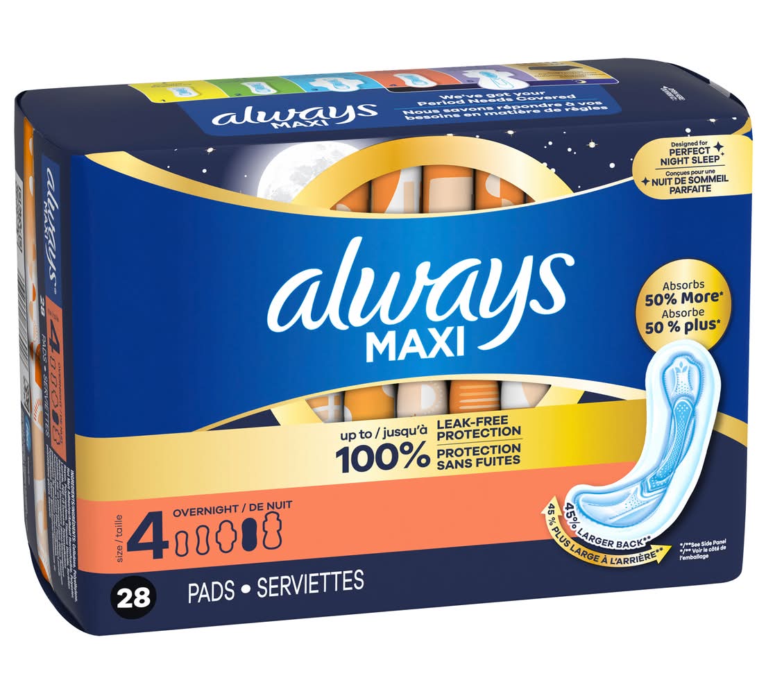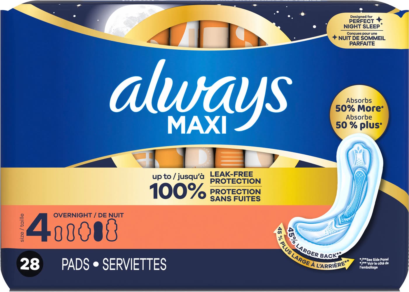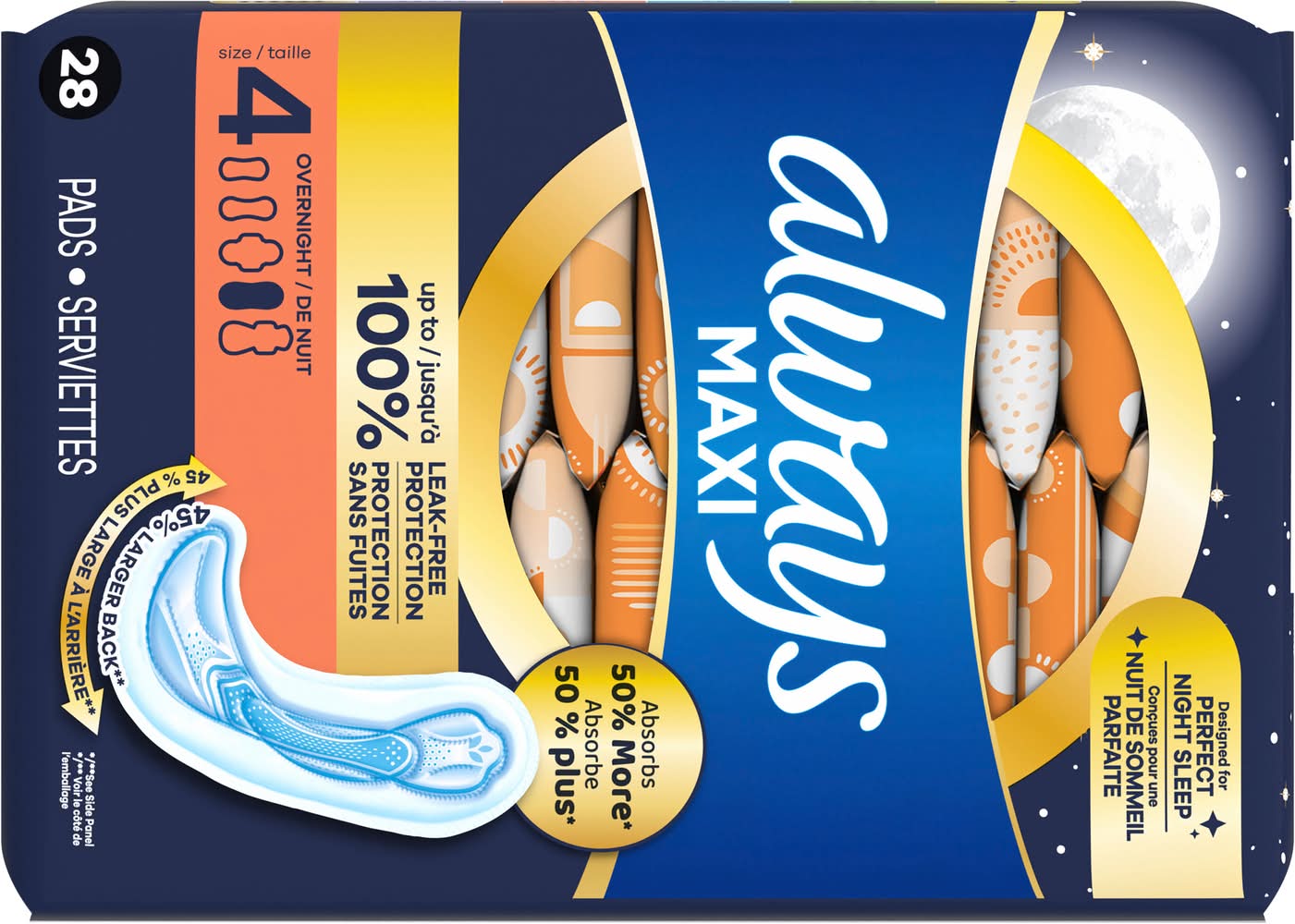 Choose Your Combo: Light Flow: Day - Size 1; Night - Size 4. Moderate Flow: Day - Size 2; Night - Size 4. Heavy Flow: Day: Size 3; Night - Size 5. For the ultimate overnight protection Always period underwear. 3X Protection System: Rapid dry + Securely fits + Leak guard. 1. Rapid Dry: Absorbs in seconds. 2. Leak Guard: For long-lasting protection. 3. Securely Fits: Keeps the pad in place. • Size: 4 • Packaging: Reusable