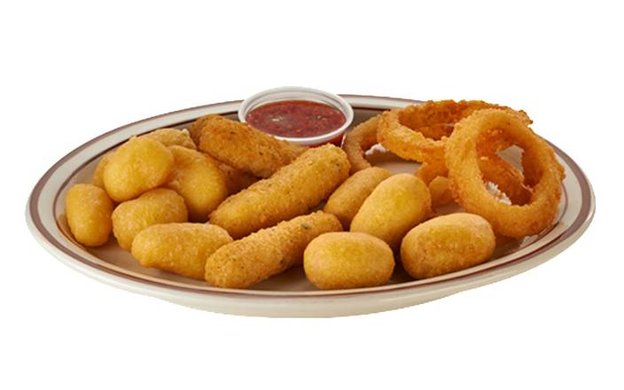 Onion rings, golden mini corn dogs, lightly breaded mozzarella cheese sticks, and beer battered cheese curds.