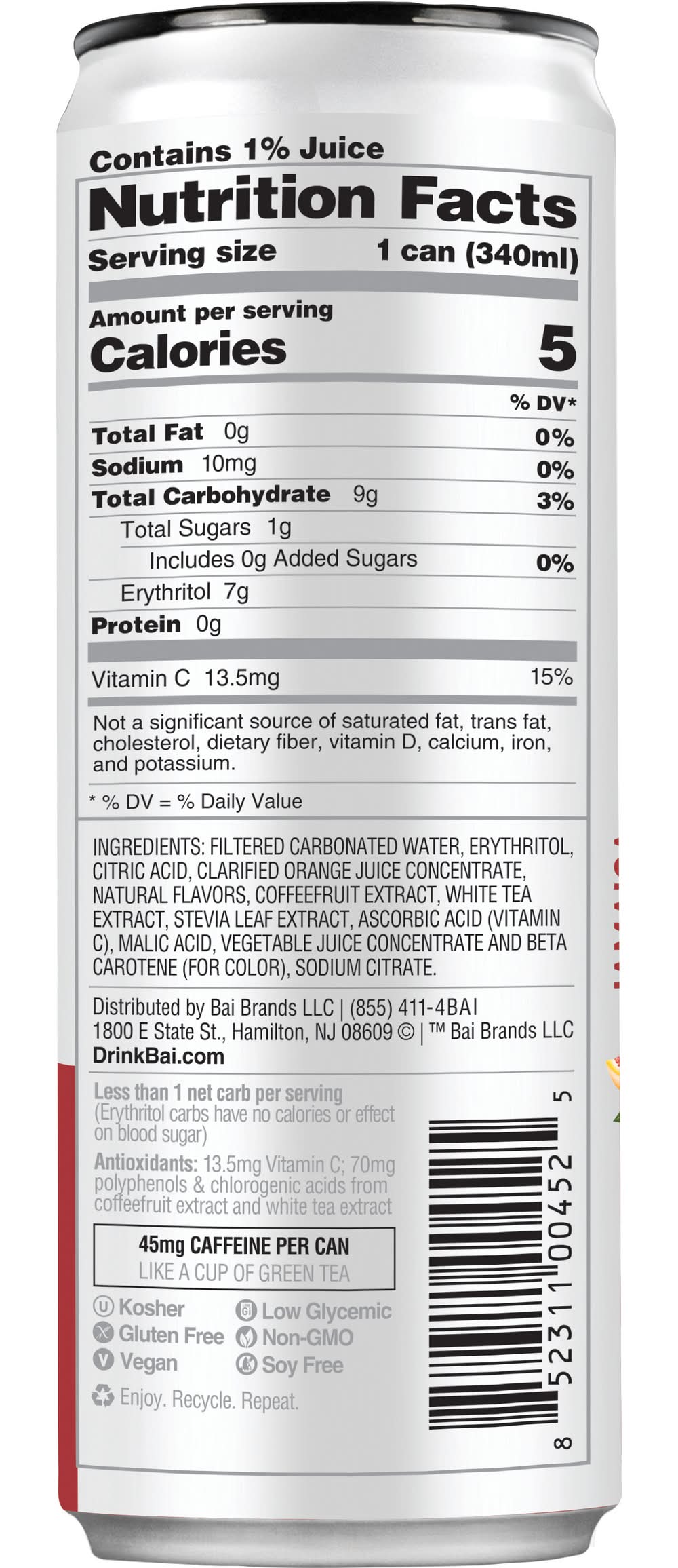 Ingredients: Filtered Carbonated Water, Erythritol, Citric Acid, Clarified Orange Juice Concentrate, Natural Flavors, Coffeefruit Extract, White Tea Extract, Stevia Leaf Extract, Ascorbic Acid Vitamin C, Malic Acid, Vegetable Juice Concentrate and Beta Carotene for Color, Sodium Citrate.