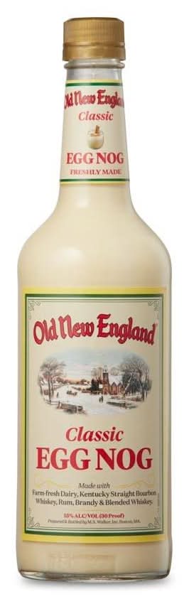 Old New England Classic Egg Nog is a traditional holiday beverage crafted with fresh dairy from local farms. It contains a blend of imported brandy, smooth whiskey, imported rum, and Kentucky bourbon, offering a rich and authentic taste. Natural nutmeg is added to enhance the flavor, staying true to its home-style origins. This product contains an alcohol by volume of 15%. It is produced with pride in New England. Alcohol by volume: 15%
