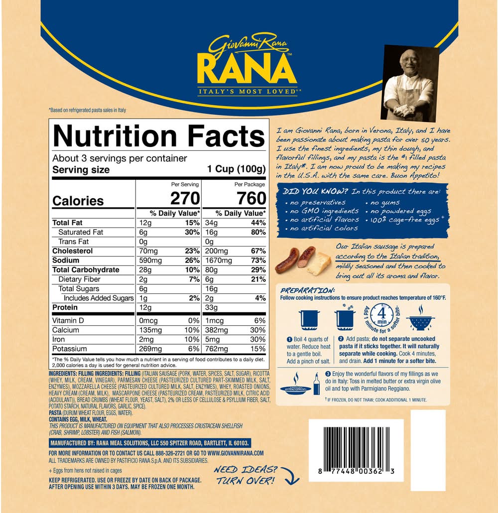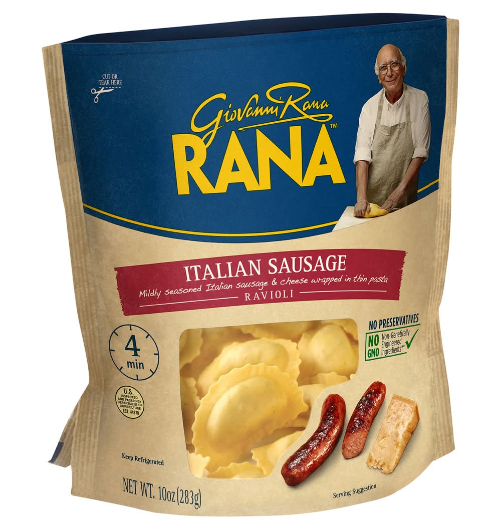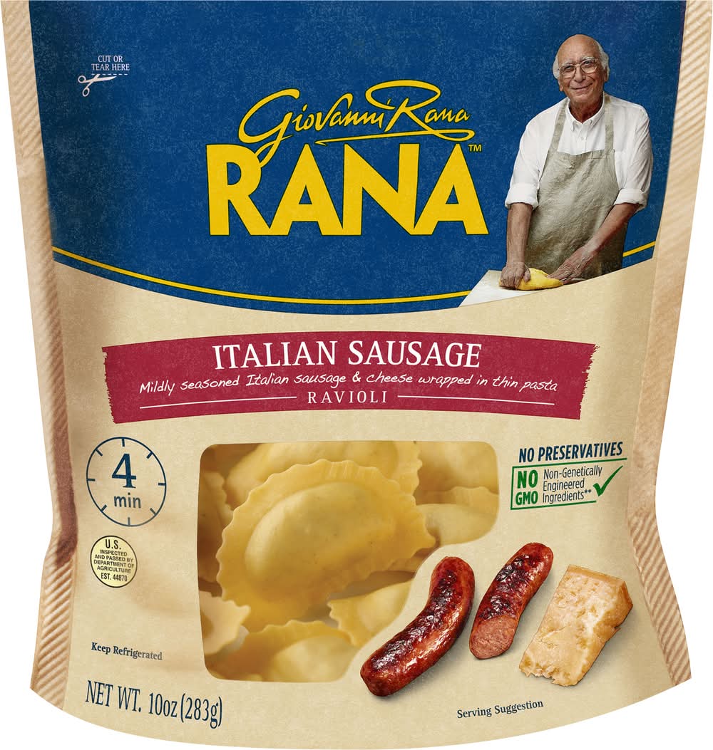 Italian Sausage Ravioli. Mildly seasoned Italian sausage and cheese wrapped in thin dough. Packed with 16 grams of protein per serving. Made with no artificial flavors, no artificial colors, no preservatives, and no GMO ingredients. Ready in 4 minutes. Italian Sausage Ravioli goes well with broccoli and garlic Alfredo sauce. I am Giovanni Rana, born in Verona, Italy, and I have been passionate about making pasta for over 60 years. I use the finest ingredients with my thin dough and flavorful fillings. I am now proud to be making my recipes in the USA with the same care. Buon Appetito! Rana Meal Solutions, LLC, 550 Spitzer Road, Bartlett, IL, 60103