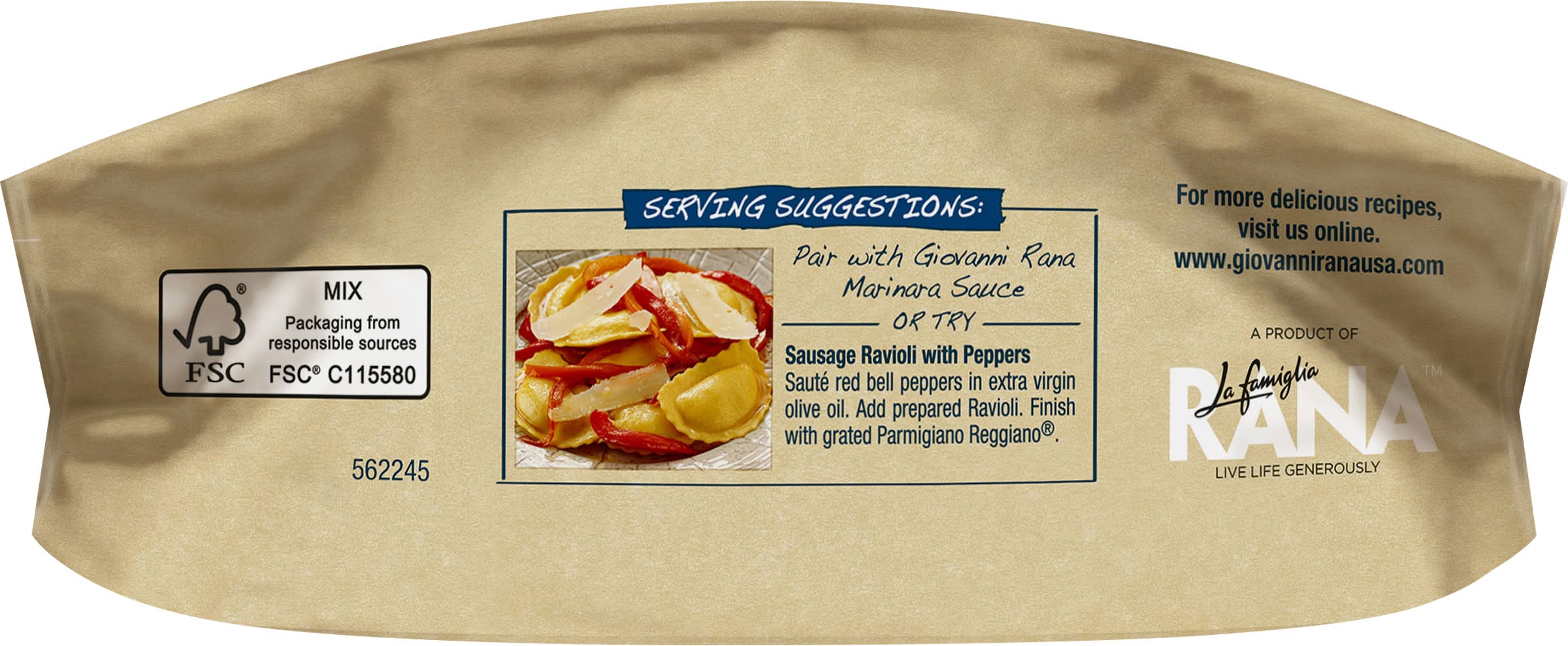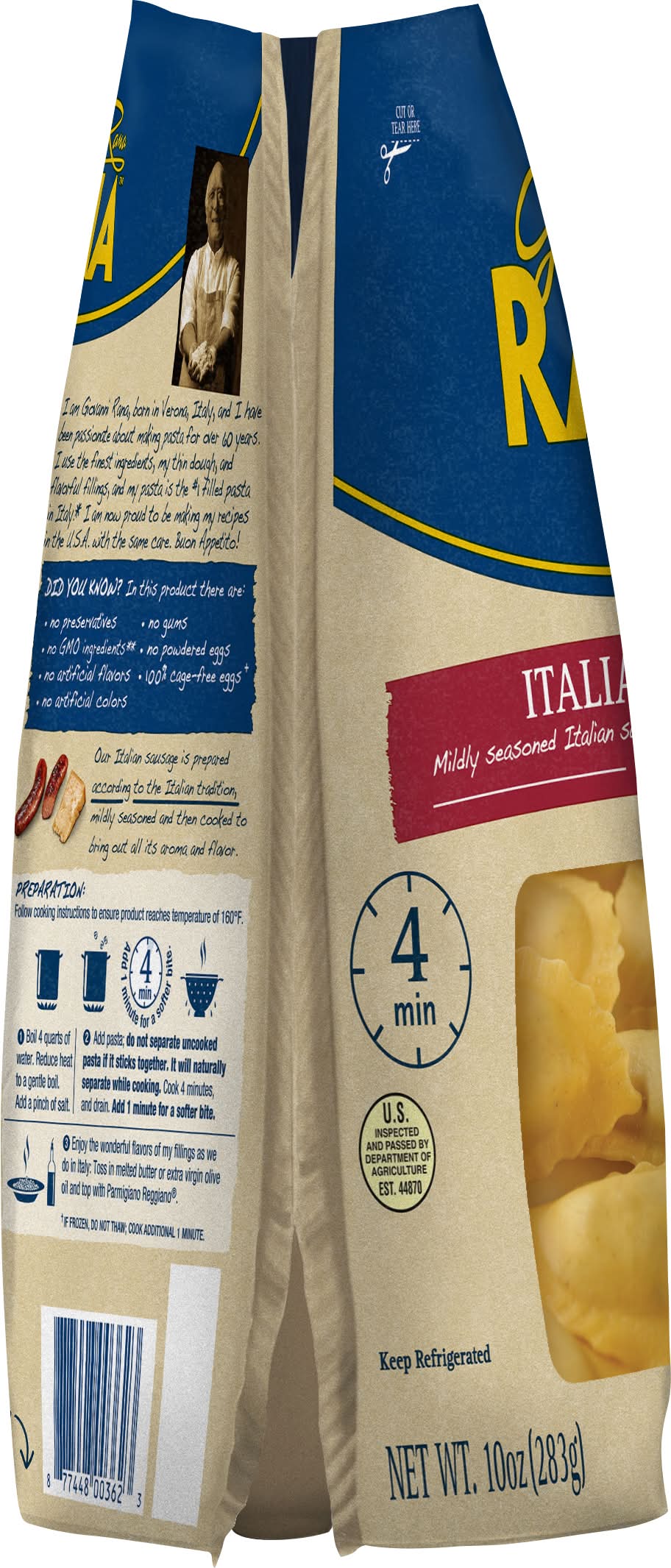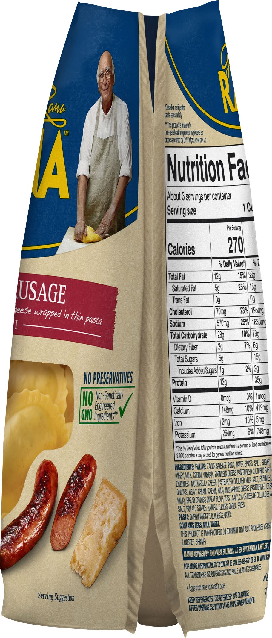 Italian Sausage Ravioli. Mildly seasoned Italian sausage and cheese wrapped in thin dough. Packed with 16 grams of protein per serving. Made with no artificial flavors, no artificial colors, no preservatives, and no GMO ingredients. Ready in 4 minutes. Italian Sausage Ravioli goes well with broccoli and garlic Alfredo sauce. I am Giovanni Rana, born in Verona, Italy, and I have been passionate about making pasta for over 60 years. I use the finest ingredients with my thin dough and flavorful fillings. I am now proud to be making my recipes in the USA with the same care. Buon Appetito! Rana Meal Solutions, LLC, 550 Spitzer Road, Bartlett, IL, 60103