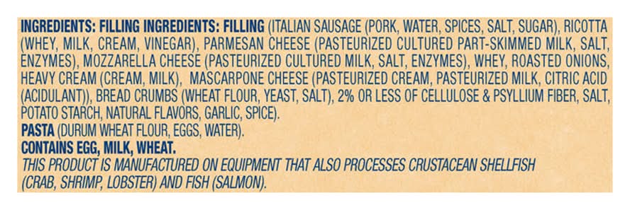 Ingredients: Filling Ingredients: Filling (Italian Sausage (Pork, Water, Spices, Salt, Sugar), Ricotta (Whey, Milk, Cream, Vinegar), Parmesan Cheese (Pasteurized Cultured Part-Skimmed Milk, Salt, Enzymes), Mozzarella Cheese (Pasteurized Cultured Milk, Salt, Enzymes), Whey, Roasted Onions, Heavy Cream (Cream, Milk), Mascarpone Cheese (Pasteurized Cream, Pasteurized Milk, Citric Acid (Acidulant)), Bread Crumbs (Wheat Flour, Yeast, Salt), 2% or Less of Cellulose & Psyllium Fiber, Salt, Potato Starch, Natural Flavors, Garlic, Spice). Pasta (Durum Wheat Flour, Eggs, Water) Contains: Eggs, Milk, Wheat, Crustacean Shellfish, Crustacean Shellfish, Crab, Crustacean Shellfish, Shrimp, Crustacean Shellfish, Lobster, Fish, Fish, Salmon