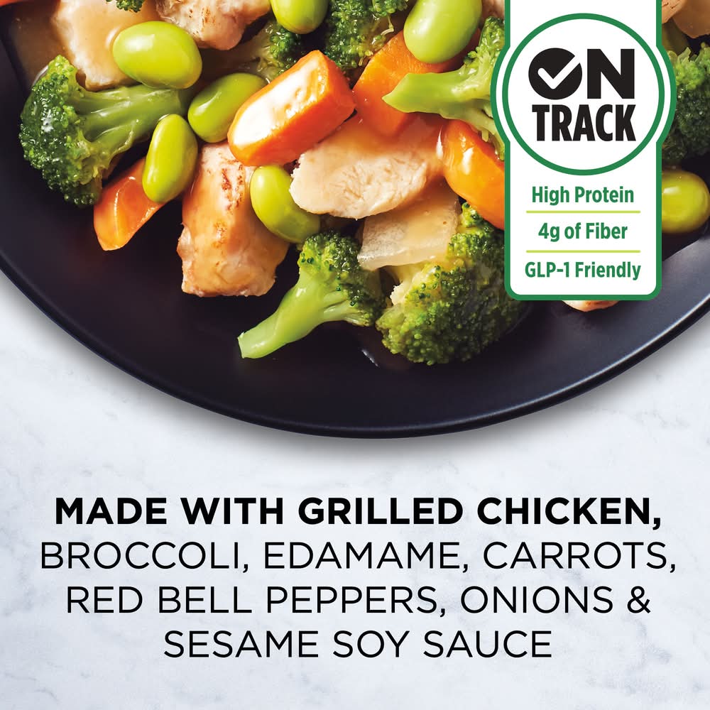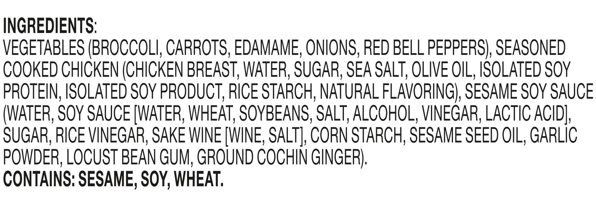 Ingredients: Vegetables: Broccoli, Carrots, Edamame, Onions, Red Bell Peppers. Seasoned Cooked Chicken: Chicken Breast, Water, Sea Salt, Sugar, Olive Oil, Isolated Soy Protein, Natural Flavoring. Sesame Soy Sauce: Water, Soy Sauce [Water, Wheat, Soybeans, Salt, Alcohol, Vinegar, Lactic Acid], Sugar, Rice Vinegar, Sake Wine [Contains Salt], Corn Starch, Garlic Puree, Sesame Oil, Ginger Puree, Locust Bean Gum. Contains: Soybeans, Wheat, Corn, Sesame