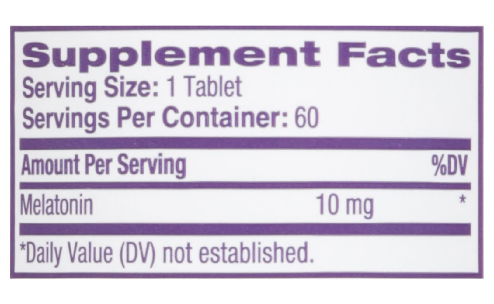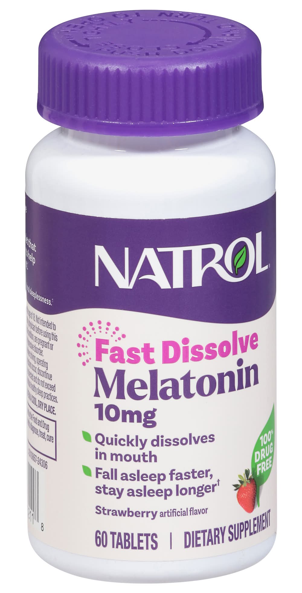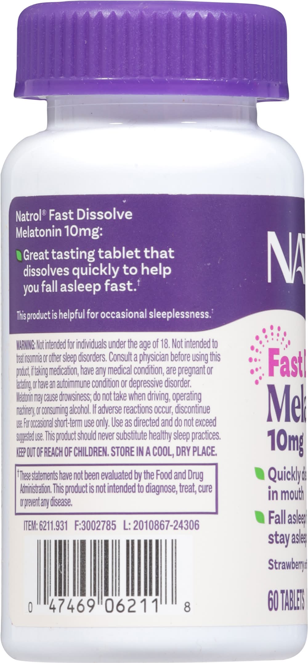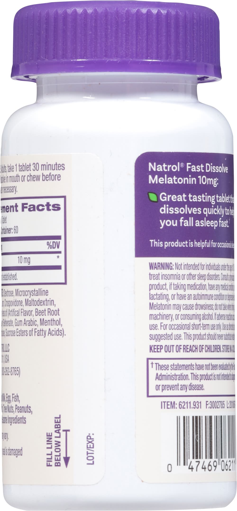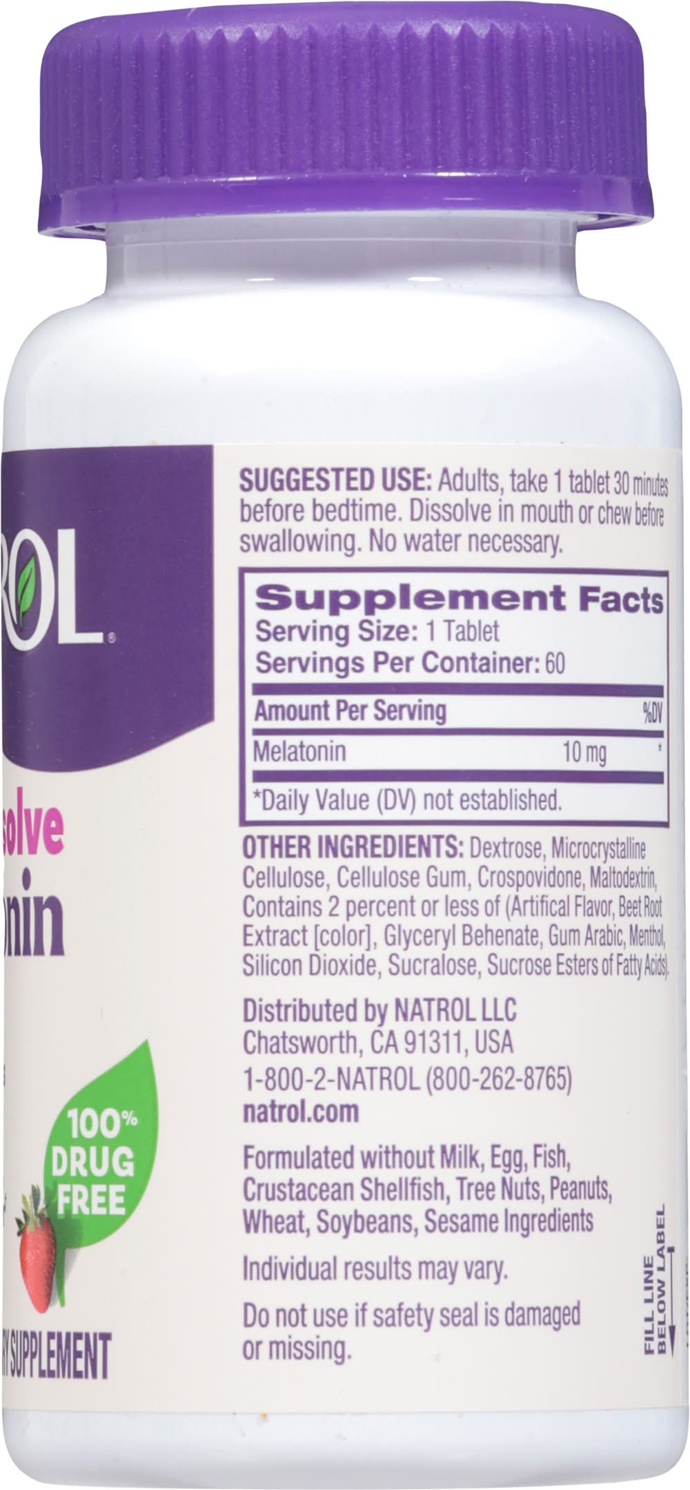 Dietary Supplement. Artificial flavor. No: milk, egg, fish, crustacean shellfish, tree nuts, peanuts, wheat, soybeans, sesame. Fast dissolve. Fall asleep faster, stay asleep longer. Wake up refreshed. 100% drug free. Natrol Melatonin 10 mg Fast Dissolve: Great tasting tablet that dissolves quickly to help you fall asleep fast. • Natrol LLC, Chatsworth, CA, 91311 • Packaging: Reusable