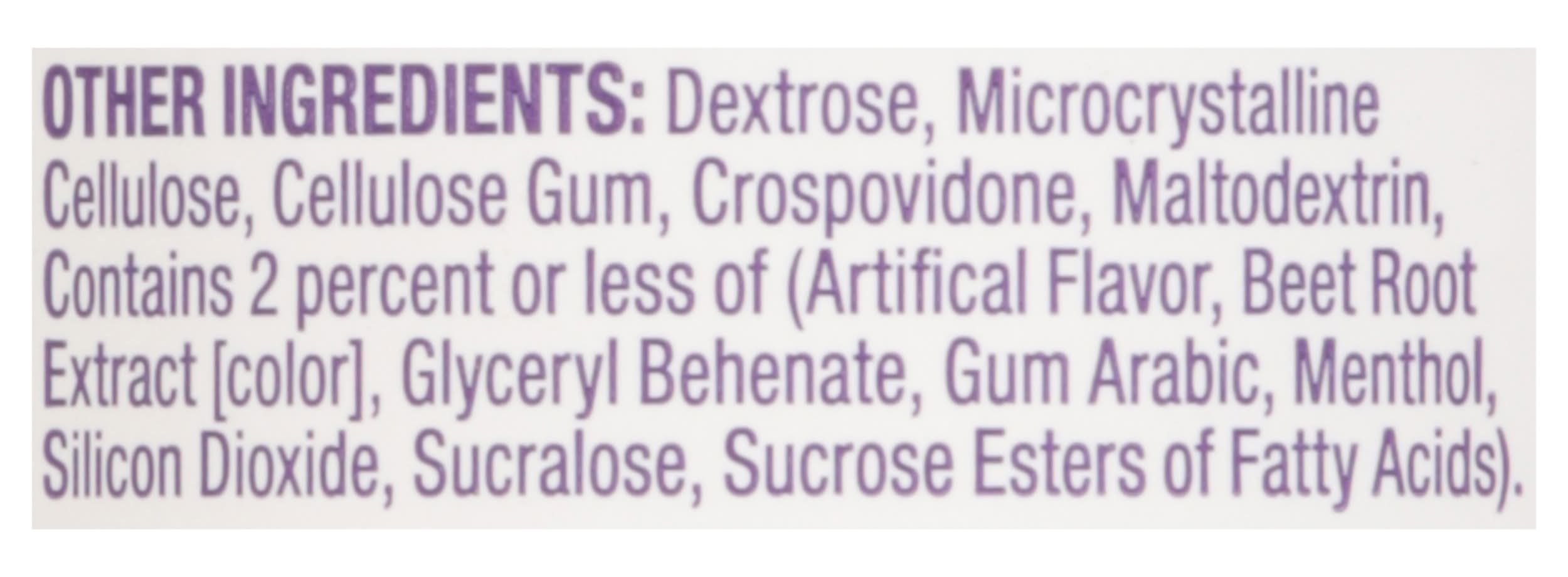 Ingredients: Other Ingredients: Dextrose, Microcrystalline Cellulose, Cellulose Gum, Crospovidone, Maltodextrin, Contains 2 Percent or Less of (Artifical Flavor, Beet Root Extract [Color], Glyceryl Behenate, Gum Arabic, Menthol Silicon Dioxide, Sucralose, Sucrose Esters of Fatty Acids)