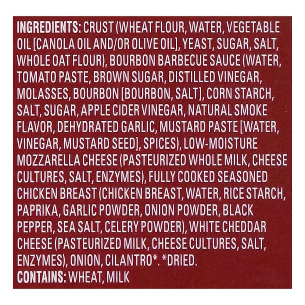 Ingredients: Crust (Wheat Flour, Water, Vegetable Oil [Canola Oil and/or Olive Oil], Yeast, Sugar, Salt, Whole Oat Flour), Bourbon Barbecue Sauce (Water, Tomato Paste, Brown Sugar, Distilled Vinegar, Molasses, Bourbon [Bourbon, Salt], Corn Starch, Salt, Sugar, Apple Cider Vinegar, Natural Smoke Flavor, Dehydrated Garlic, Mustard Paste [Water, Vinegar, Mustard Seed], Spices), Low-Moisture Mozzarella Cheese (Pasteurized Whole Milk, Cheese Cultures, Salt, Enzymes), Fully Cooked Seasoned Chicken Breast (Chicken Breast, Water, Rice Starch, Paprika, Garlic Powder, Onion Powder, Black Pepper, Sea Salt, Celery Powder), White Cheddar Cheese (Pasteurized Milk, Cheese Cultures, Salt, Enzymes), Onion, Cilantro*. *Dried Contains: Wheat, Milk, Oat, Mustard, Celery