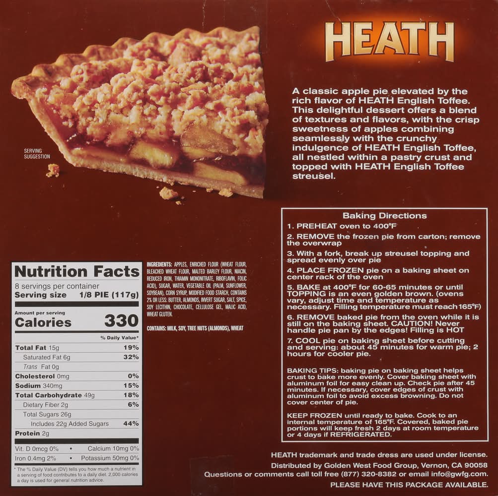 Traditional apple pie filling in a pastry crust, with a Heath English Toffee streusel topping. A classic apple pie elevated by the rich flavor of Heath English Toffee. This delightful dessert offers a blend of textures and flavors, with the crisp sweetness of apples combining seamlessly with the crunchy indulgence of Heath English Toffee, all nestled within a pastry crust and topped with Heath English Toffee streusel. Questions or comments call toll free (877) 320-8382 or email info@gwfg.com. Please have this package available. Flavor: Apple
