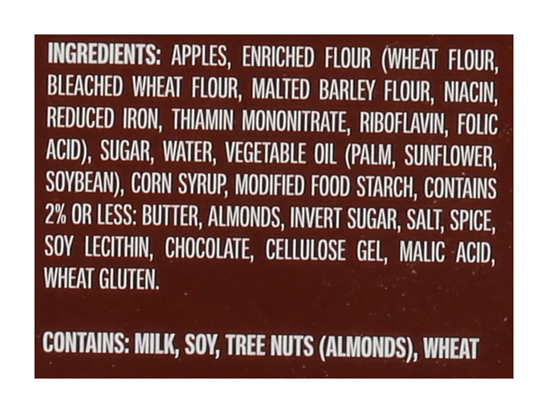 Ingredients: Apples, Enriched Flour (Wheat Flour, Bleached Wheat Flour, Malted Barley Flour, Niacin, Reduced Iron, Thiamin Mononitrate, Riboflavin, Folic Acid), Sugar, Water, Vegetable Oil (Palm, Sunflower, Soybean), Corn Syrup, Modified Food Starch, Contains 2% or Less: Butter, Almonds, Invert Sugar, Salt, Spice, Soy Lecithin, Chocolate, Cellulose Gel, Malic Acid, Wheat Gluten Contains: Milk, Soybeans, Tree Nuts, Tree Nuts, Almonds, Wheat, Gluten, Barley