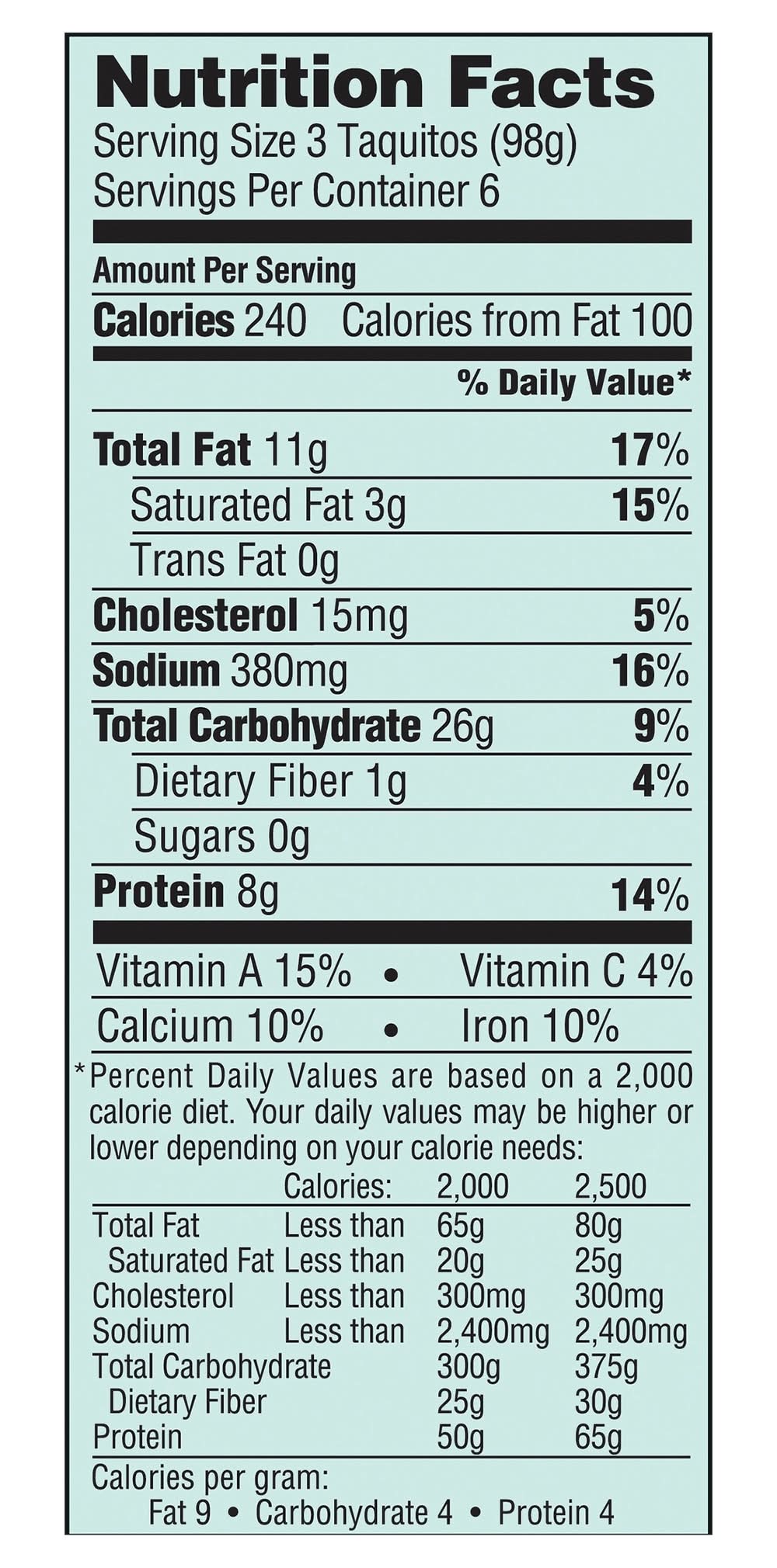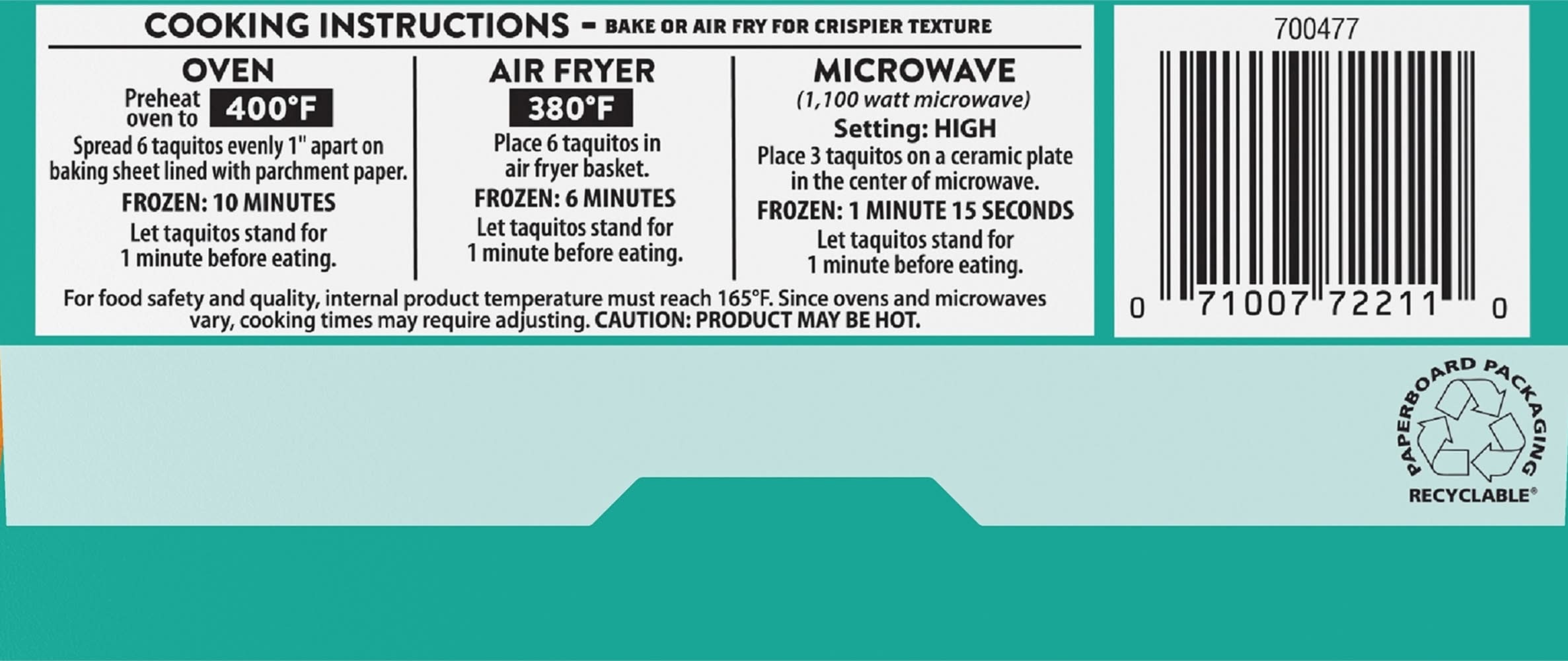 Directions for use: Oven: Preheat oven to 400 degrees F. Spread 6 taquitos evenly 1 inch apart on baking sheet lined with parchment paper. Frozen: 10 minutes. Let taquitos stand for 1 minute before eating. Air Fryer: 380 degrees F. Place 6 taquitos in air fryer basket. Frozen: 6 minutes. Let taquitos stand for 1 minute before eating. Microwave (1,100 watt microwave): Setting: High. Place 3 taquitos on a ceramic plate in the center of microwave. Frozen: 1 minute 15 seconds. Let taquitos stand for 1 minute before eating. Cooking Instructions - bake or air fry for crispier texture. For food safety and quality, internal product temperature must reach 165 degrees F. Since ovens and microwaves vary, cooking times may require and adjusting. Caution: Product may be hot. Keep frozen. Storage recommendation: Keep frozen.