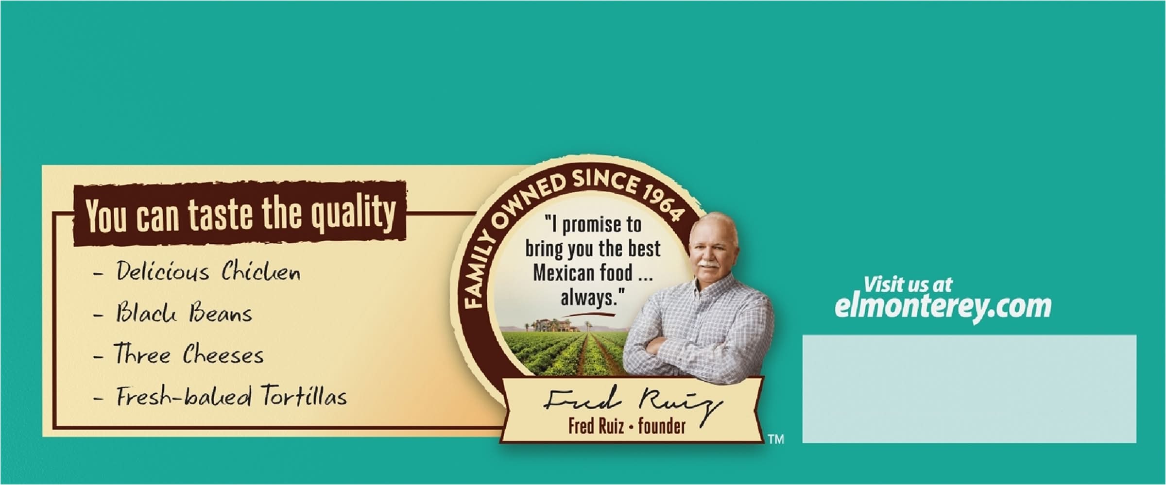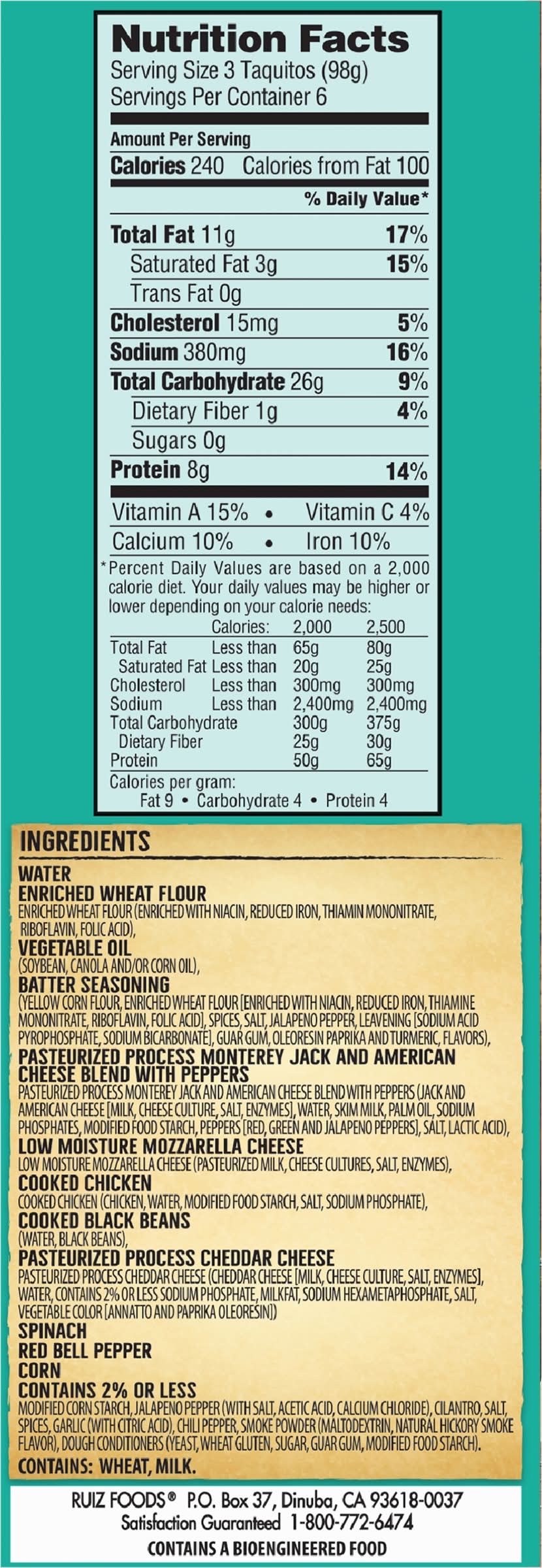 Contains a bioengineered food. Cook & serve. Microwaveable. Family owned since 1964. In a crispy seasoned shell. I promise to bring you the best Mexican food. • Ruiz Foods, P.O. Box 37,Dinuba,CA,93618-0037 • Packaging: Reusable
